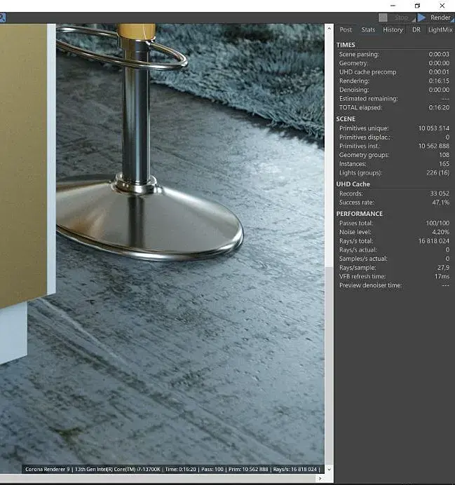 Max2023+Corona 9.3      Core i7 13700K @5.3/4.2 = 16.20