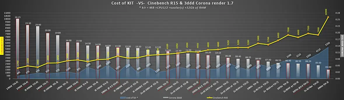 Ну ксеоны в работе медлительные, но и цена 15к мать на два проца, и пара процов  8 к или вообще 3 к рубелй. Бомж набор который рендерит тест на 18. 40 В работе все же неплохо когда одно ядро шустрое тут максимум 3.8