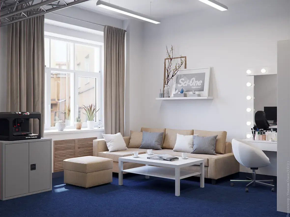 Пару лет назад я в качестве волонтёра (и не брать деньги за эту работу было именно моей инициативой) делала виз студии для студии Sci-One, которая занимается научпопом. Виз получился средненький, да и переехали они потом в другое помещение, но мне все равно до сих пор приятно, что мне повезло сделать эту работу. Помню как пришлось получиться с ковролином, он упорно отказывался перестать тайлить :D А ещё я тогда решила не моделить кое-что, а нагло это прифотошопить XD И, знаете, мне кажется, что вышло весьма неплохо.
