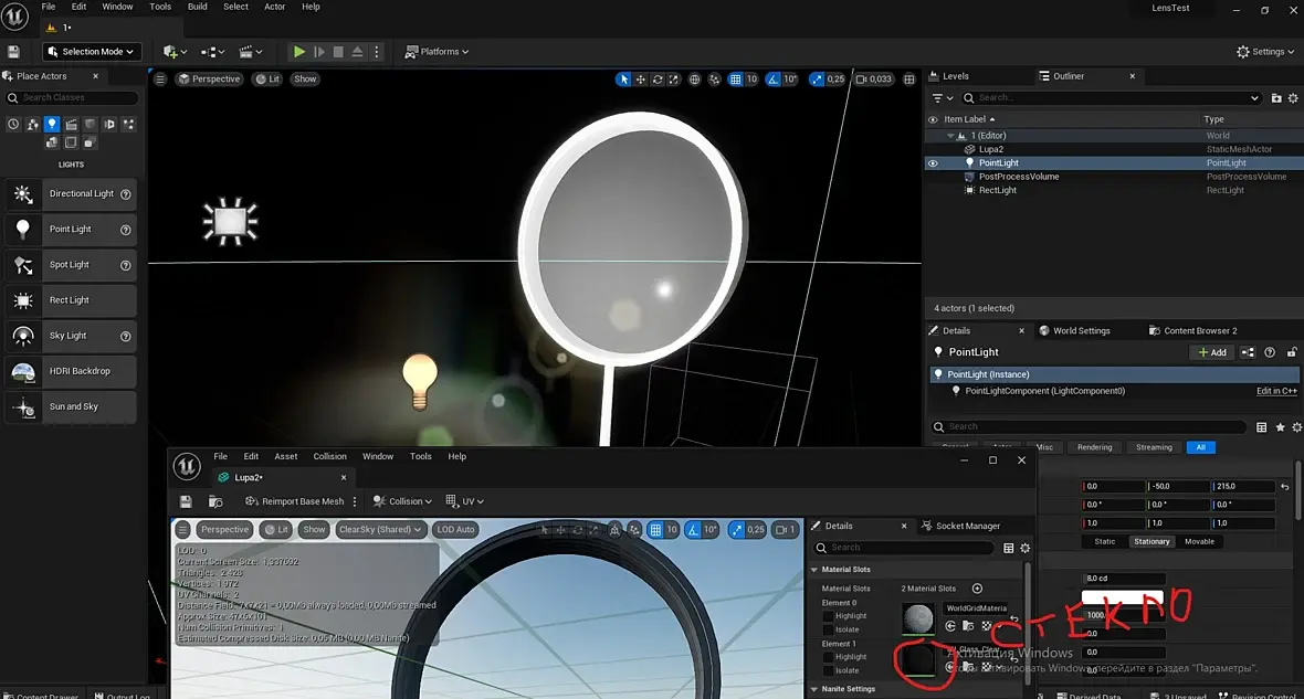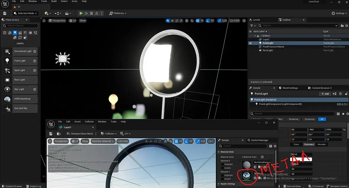 При этом отражений нет именно от Rect Light. От Spot Light и Point Light отражения на стекле есть , это видно на скринах. И от HDR отражения есть
