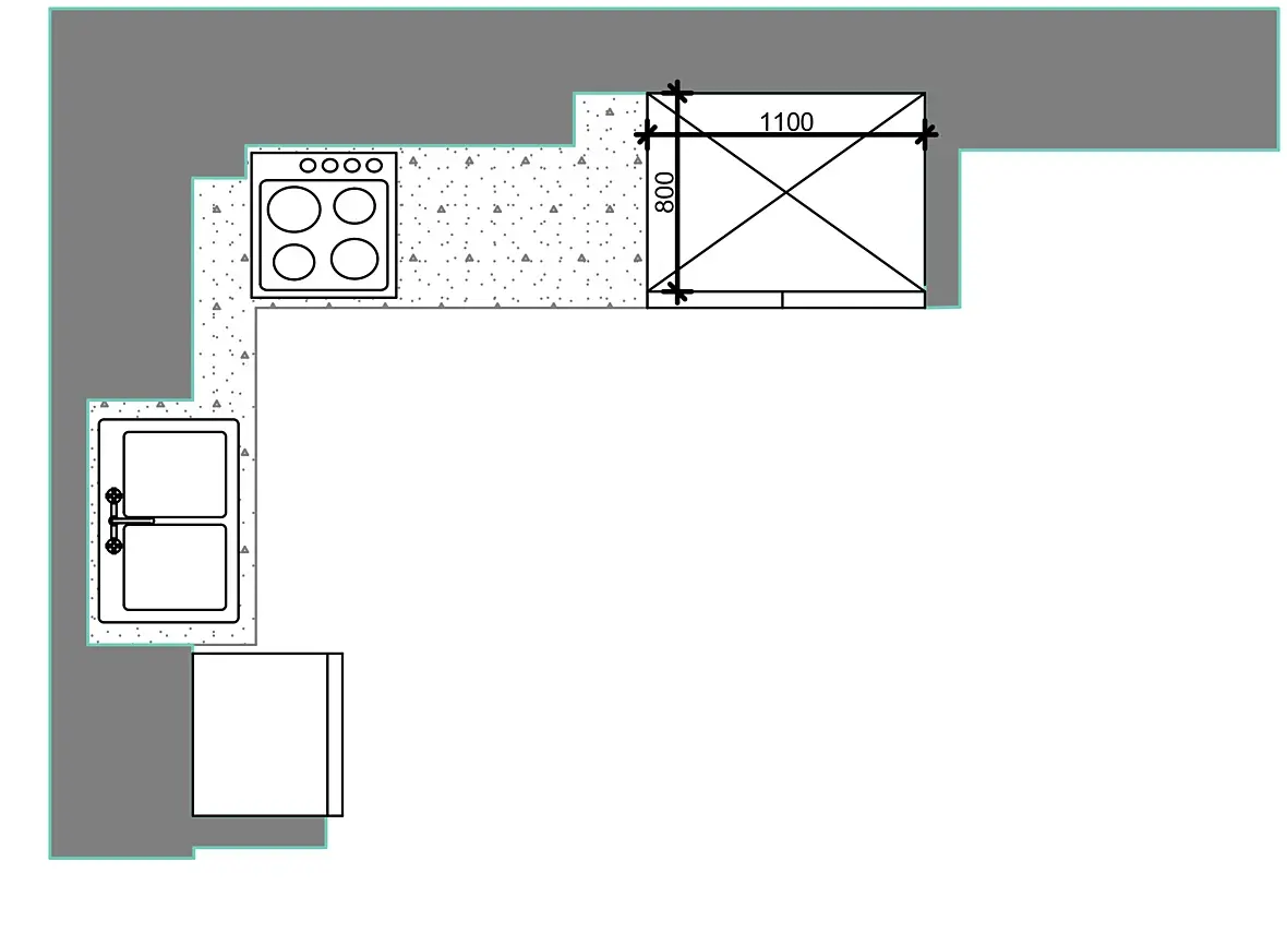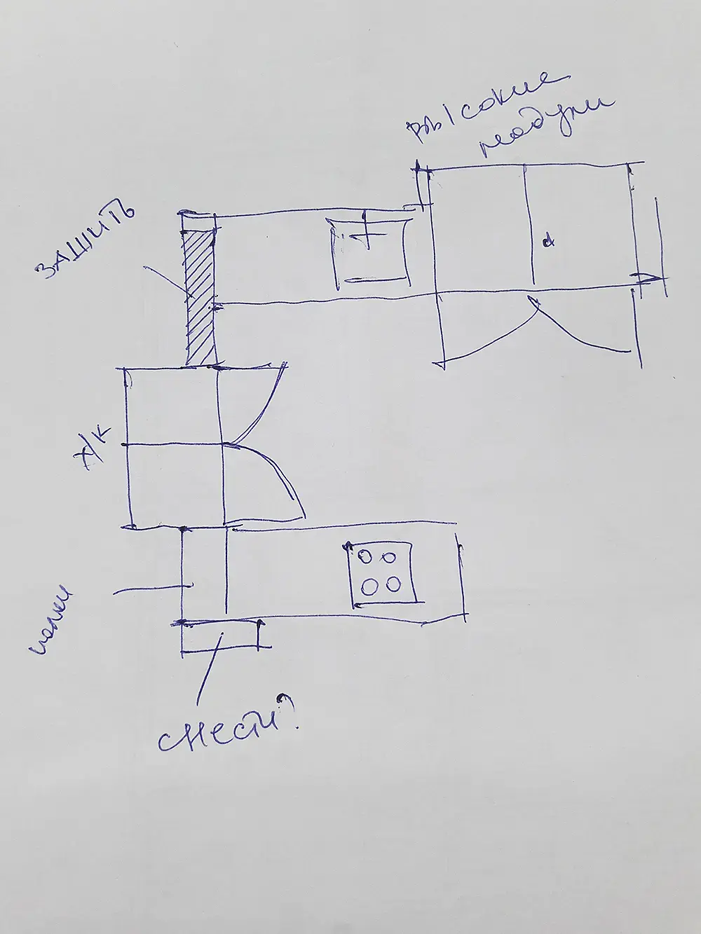 Извиняюсь за кривые почеркушки, я бы думала в какую-то такую сторону, если планировка позволяет. Ну только высокие модули в верхнем правом углу слишком уж глубокие получаются, рукой будет сложно достать. Либо зашить за ними, чтобы фасады модулей были вровень с кухней, либо "утопить" их относительно фасадов остальной части кухни. Конечно рабочей поверхности маловато и цикл нарушен, но плюсы у такой планировки тоже есть.