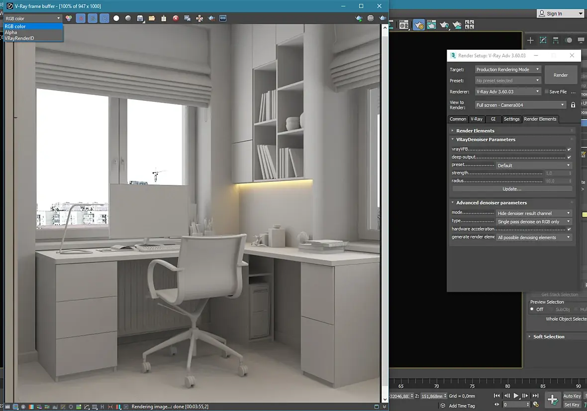 Присоеденяюсь к проблеме описанной автором поста. После просчета рендера, VRayDenoiser не срабатывает. В окне VFB этот элемент не отображается. У меня добавлено 2 рендер элемента VRayRenderID и VRayDenoiser. Так вот VRayRenderID появляется, а тот нет. Включение галочек на Enable "включение сохранения в прописаный путь" ситацию не меняет. Кто то знает с чем это связано и что делать?