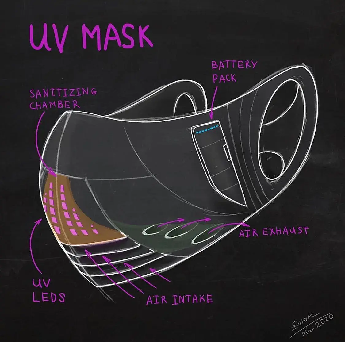 Если коротко, то идея заключается в том, что бы за счет системы клапанов загонять воздух из вне в камеру, в которой он, воздух будет, проходить обработку УФ, по мимо фильтра. Проект не коммерческий, идея в том что может быть все же подхватит кто-то доработает и произведет для врачей. Более подробно, это уже к автору, например сюда: