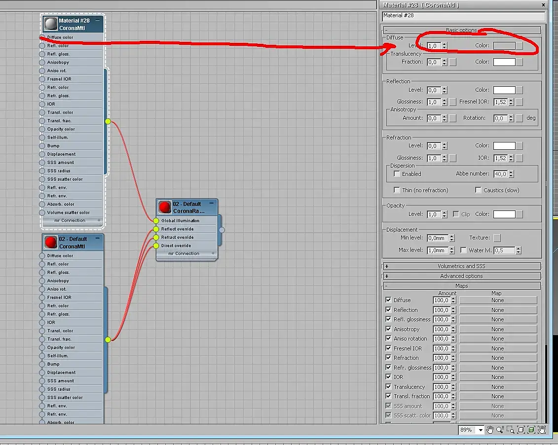 так а я о чем. Конечнго в правильном. Только отражение без каустики не имеет значения, а значение имеет только цвет диффуза - и чем он агрессивней - тем сильнее передается на другие поверхности. Есть 3 варианта решения - уменьшить яркость света (отпадает) 2. Уменьшить яркость ЦВЕТА - тоже отпадает 3. Использовать рей свитч - годится - но с натяжкой 4. Поиметь новый регулятор в редакторе материалов - который бы и решал эту проблему без бубнов