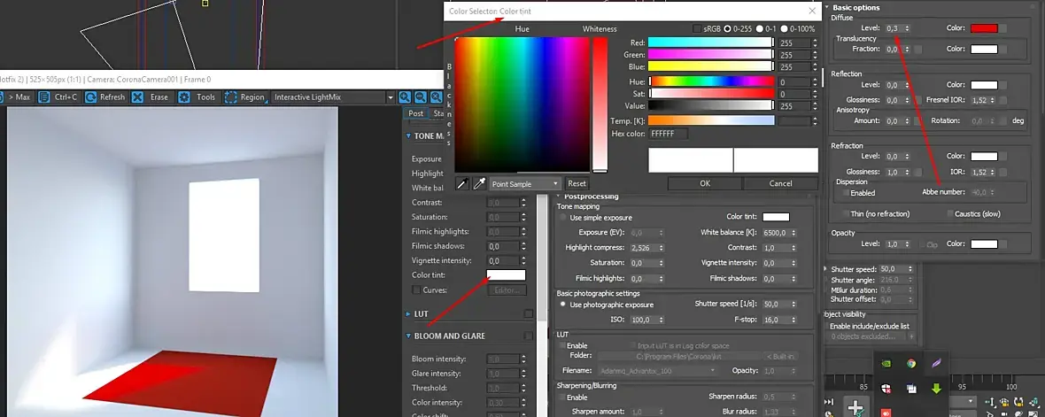 Цвет красного 200, скрутил только Level (чем меньше, тем отражений меньше). Есть ещё Color Tint, т.е. на втором скрине крутанул его в сторону синего, а Level красного ковра вернул до 1.