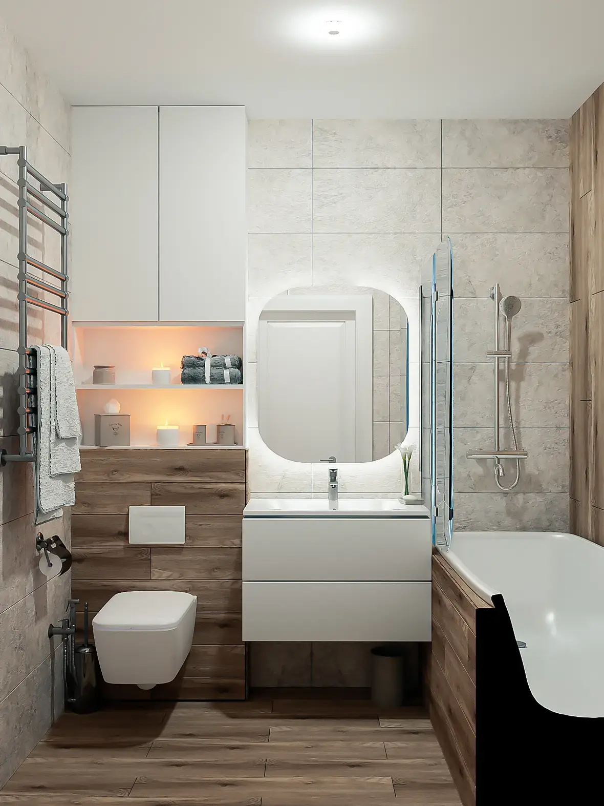 Уважаемые форумчане, оцените плиз визуал. Хочется лучше, но уперся в уровень и не понимаю что еще можно улучшить чтоб была живая объемная визуалка?! Говорят нужно комплиментарный свет создавать. Но как создавать если это закрытое помещение типа санузла с 2-3 приборами, которые не в комплименте находятся друг другу? Может еще что подскажите? Буду благодарен объективной критике)
