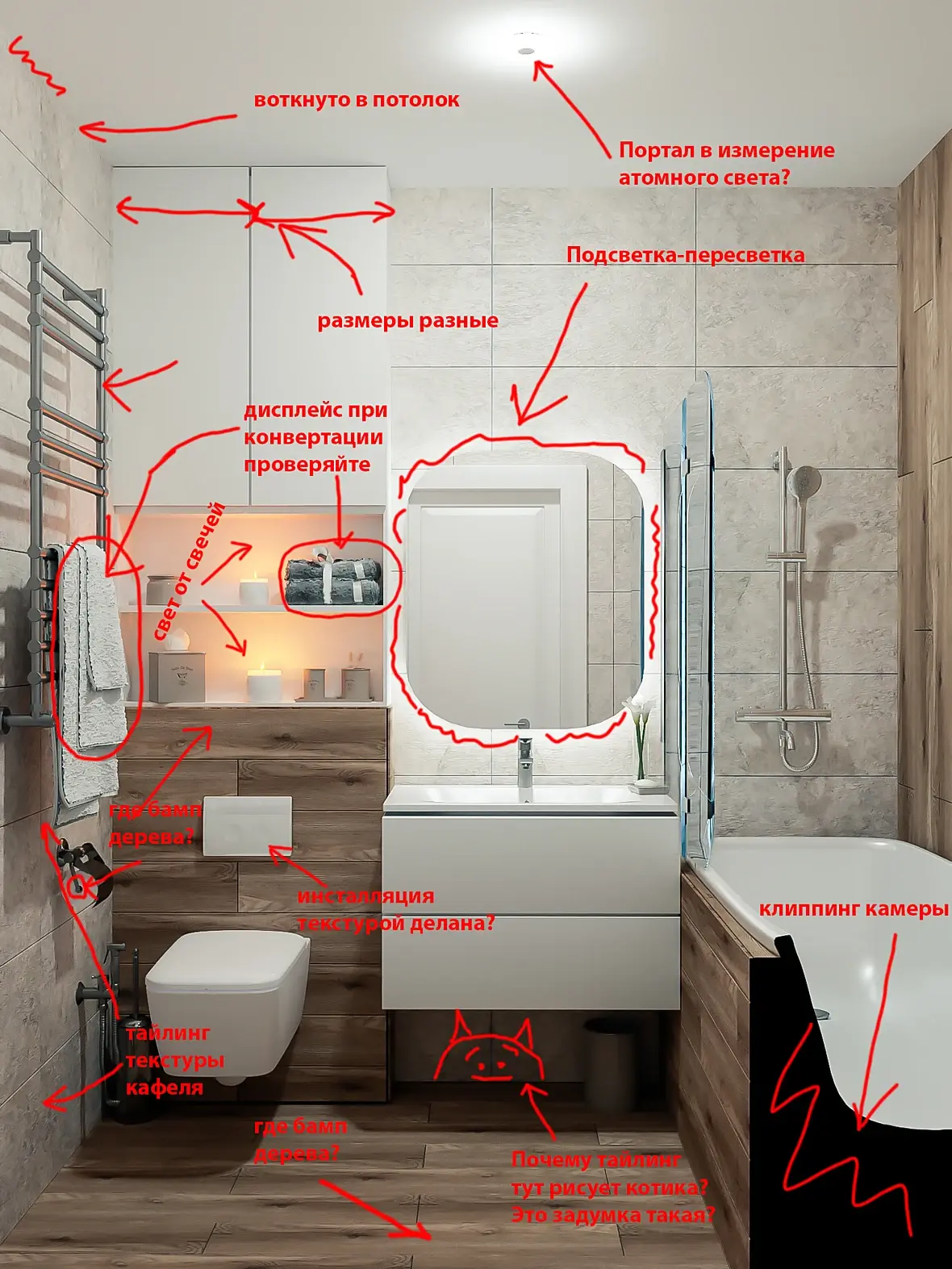 Бампа дерева нет, ну и что? Может плитка гладкая? Тайлинг кафеля есть, плитка же (не особо то и видно его), а не резаный мрамор. Рисует котика и ладно, всем нравятся котики, а это просто парейдолия. Инсталляция делана текстурой, допустим. Это не криминал )) Переделать геометрией? Оставить так? Свет от свечей есть, горят. Погасить? Разжечь сильнее?. Подсветка не такая уж и пересветка, зато её хорошо видно. Выключить совсем? Убавить? Прибавить? Воткнуто в потолок - ну ессесно, плитка же до потолка. Портал в измерение? Нет, не портал, а точечный светильник. Поменять?. Клиппинг - да, клиппинг ((( Так подойдёт или чё делать надо? Закрасить другим цветом? Изменить вид? Если ракурс поедет, вдруг некрасиво станет?