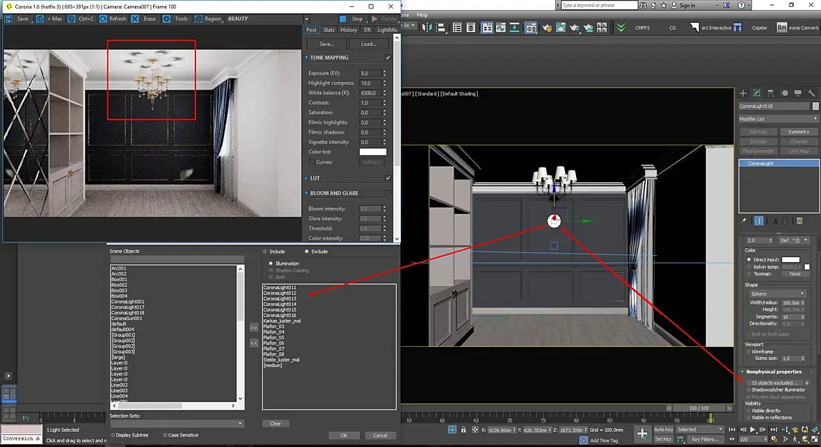 Как скрыть при рендере источники света Corona Light? В VRay, собственно, который и использует автор, чьи уроки я смотрю, можно его скрыть, а в Corona я его не нашел( Методом "Тыкни и переустанови винду" ничего не получилось(