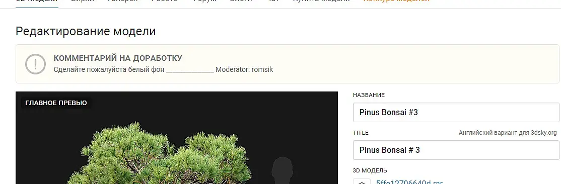 Я все это прекрасно понимаю, и вношу все требуемые корректировки, но это же все видно было сразу, почему сразу и не сказать что вот тут архив, две одинаковые модели и рендер движок указать? Все разом, я же каждый раз буду это переделывать и каждый раз модератор должен будет снова это проверять. Мне ждать модерацию 2 дня, модератору - лишний раз открывать мои модели. Не проще сразу указать на все несоответствия каким либо критериям сайта?