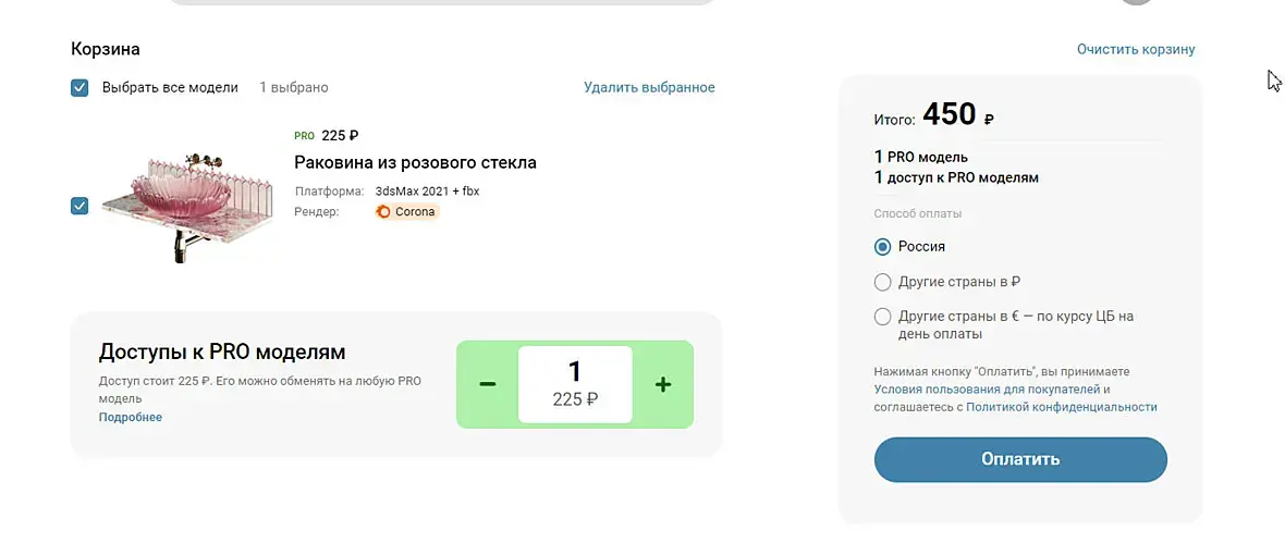 Добрый день! Почкму модель стоит 250 р, а при покупке в корзине 450. Доступ только к одной модели стоит???