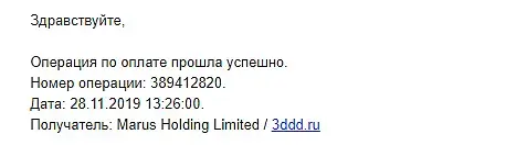 ------------------------------------------------------------------------------- Здравствуйте, Операция по оплате прошла успешно. Номер операции: 389412820. Дата: 28.11.2019 13:26:00. Получатель: Marus Holding Limited / 3ddd.ru