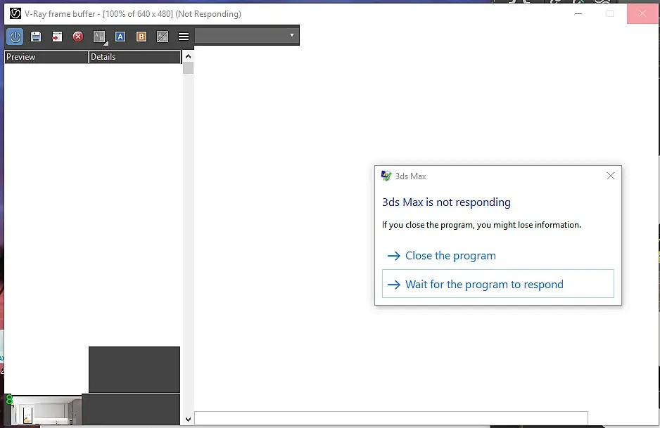 Сдраствуйте. Не знаю почему, у меня зависает 3дс Макс когда пытаюсь делать рэндэр или открывать vray буффер. Последние 7 изображении из буфера были сделаны батч рендер. Глюк начался когда хотела посмотреть на получившийся рендера ис буфера. Токга макс завис и потом уже тот фаил не могу совсем открывать "File Open Failed". В других файлах присутсвует данная проблема с буфером. я переустанавливала драйверы для видео карту, вирэй, но не помоглоМожно ли как то это починить?