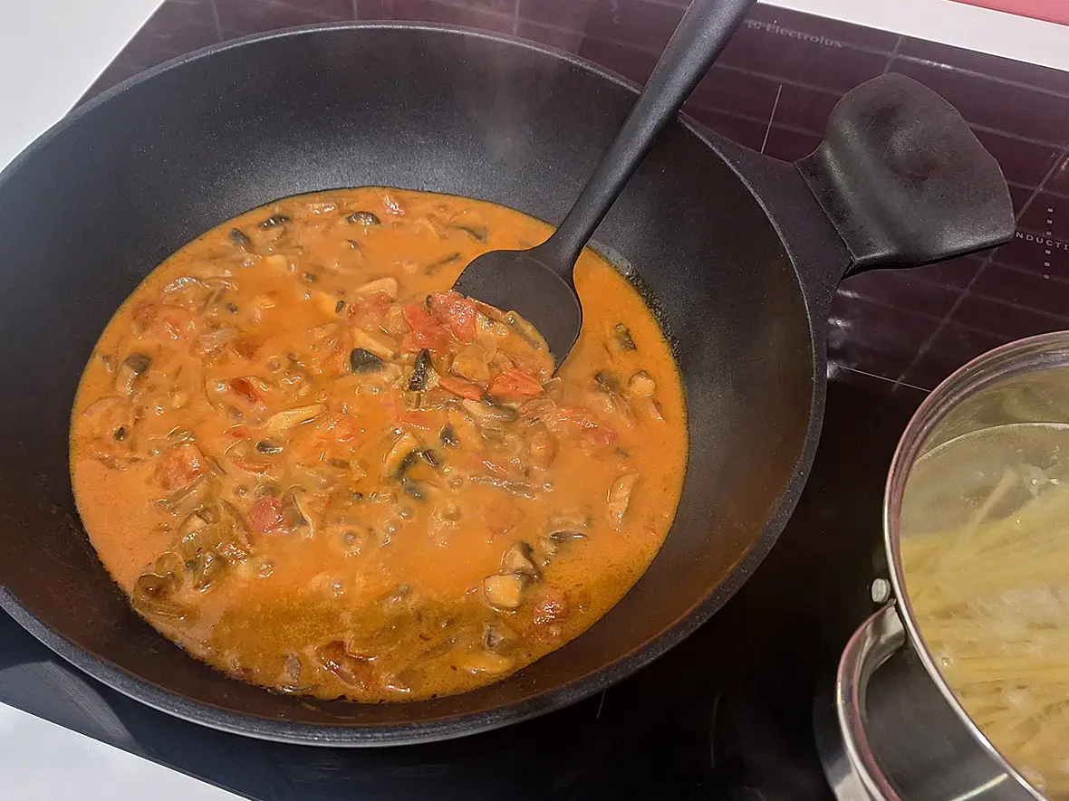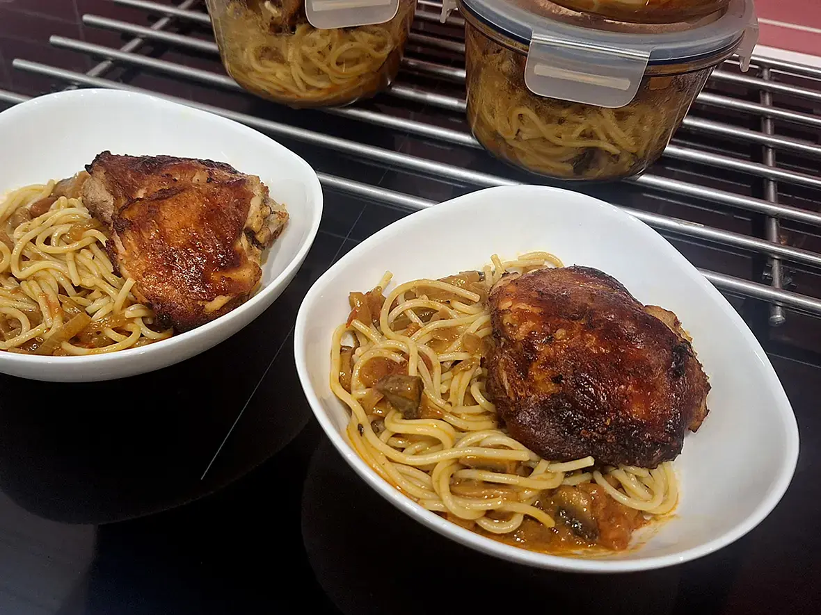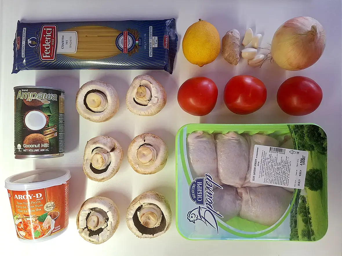 На небольшом количестве масла обжарить лук и шампиньоны. Добавить 30гр пасты, прогреть её. Затем рубленные помидоры (можно заморочиться и снять шкурку), кокосовое молоко и оставшийся после бёдрышек маринад (через сито). Тушить всё до нужной густоты. Отварить отдельно спагетти, перемешать с соусом и можно подавать