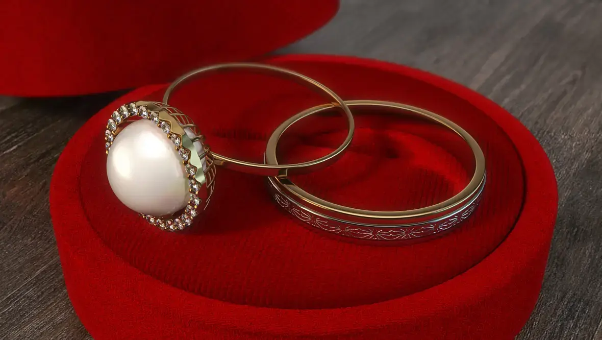 влево и в верх .Как -бы отвлекает внимание от основного объекта(кольца)