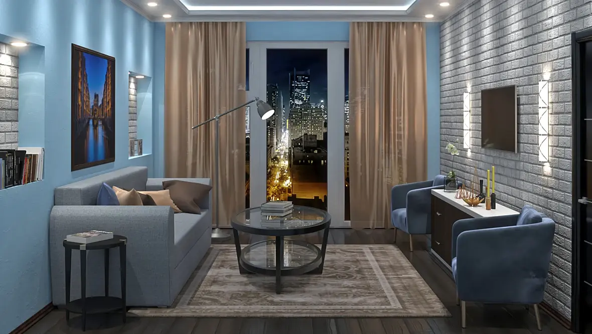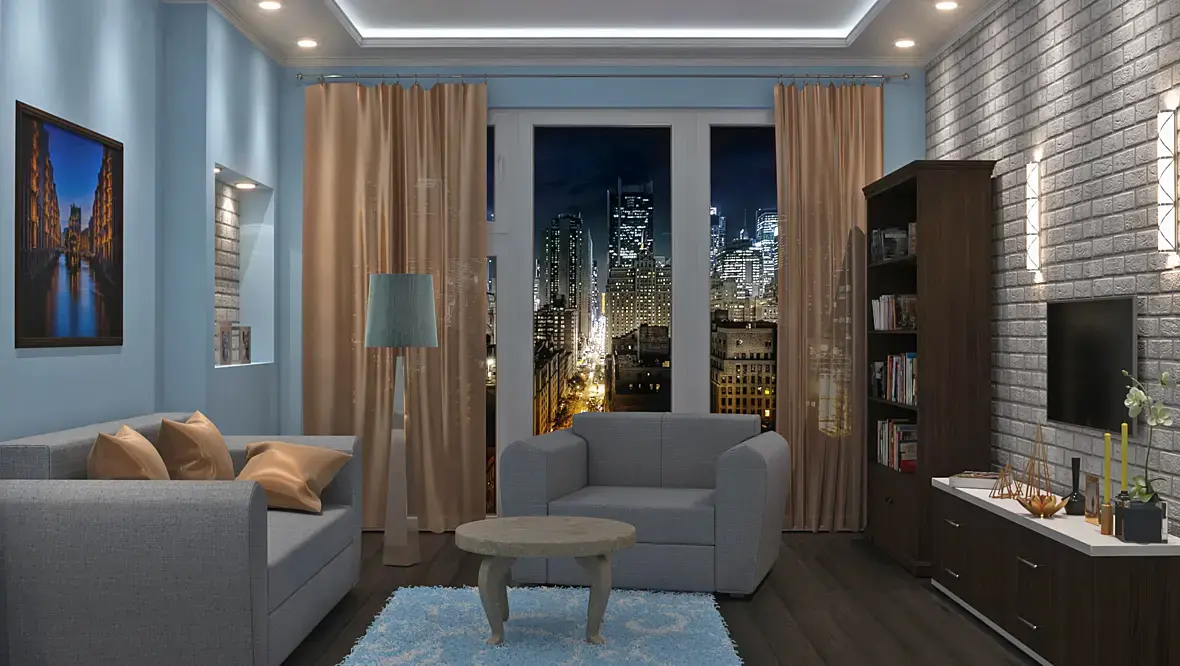 Бекграунд приглушить (затемнить, размыть или и тд.) и на нем искаженная перспектива. Модели мебели видимо бесплатные, то есть никакие. Нет центра композиции, взгляд ни на чем не фиксируется, просто все раскидано. Ковер как полотенце, столик не понятно из какого материала. Отсутствует дизайн (уж простите)1 ниша 2-х ярусный потолок и кирпич на стене это не дизайн, нет общей мысли. Советую посмотреть галерею хотя бы даже тут https://3ddd.ru/galleries/cat/interiors?order=votesRating