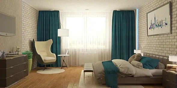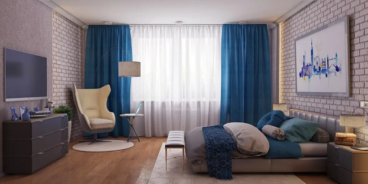 проверьте все текстуры) особенно на тв, такое ощущение что на нем совсем нет текстур)) его, кстати можно опустить ниже как и картину)) я бы еще проверила масштабы кровати и кресла) потому что главным акцентом в спальне является все-таки кровать)) у вас пока кресло выбивается)) либо другую модель кресла попробуйте) подсветку на стенах поменяйте на более теплый) на шторах нужно поправить текстуру и возможно выбрать цвет посложнее (погрязнее))) подушки и плед попробуйте сделать разных оттенков синего или из разной ткани (полосатые,клетчатые, с цветочным принтом )