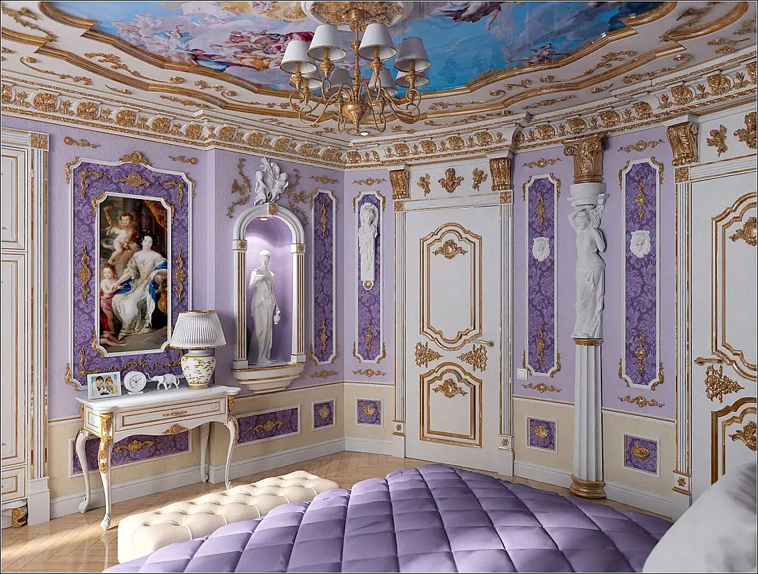 А как по мне- так почти всё и правильно- такие рококошненькие слюни. Повыкидывайте все эти козявки, на стенах и потолке. ( Лепные завитки, которые, как отдельный элемент, вообще ни когда не ставятся. Капители на пилястрах- тупо золочённые- диковато. Под золотом оставьте завиточки-листочки. Люстра может быть вполне. Злобную герцогиню справа от изголовья на лестницу- где родовые портреты, вместо неё- какого то амурчика с писюнчиком. И в общем то вполне употребимо.