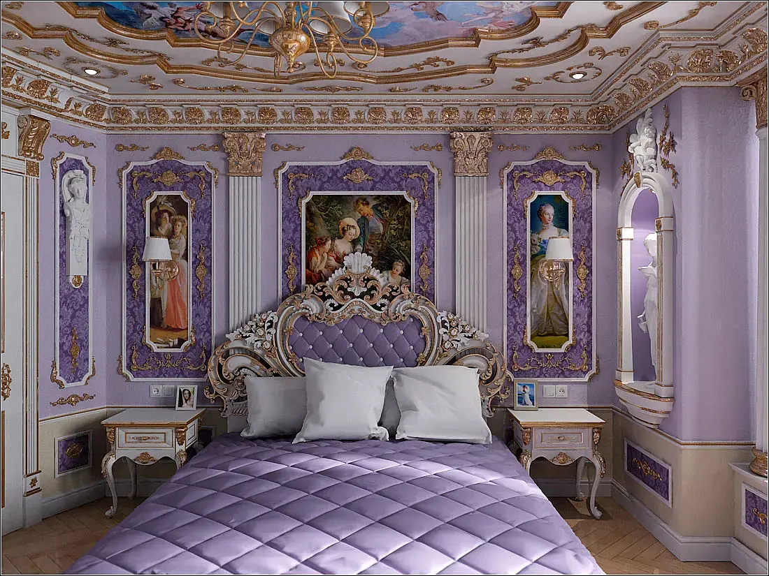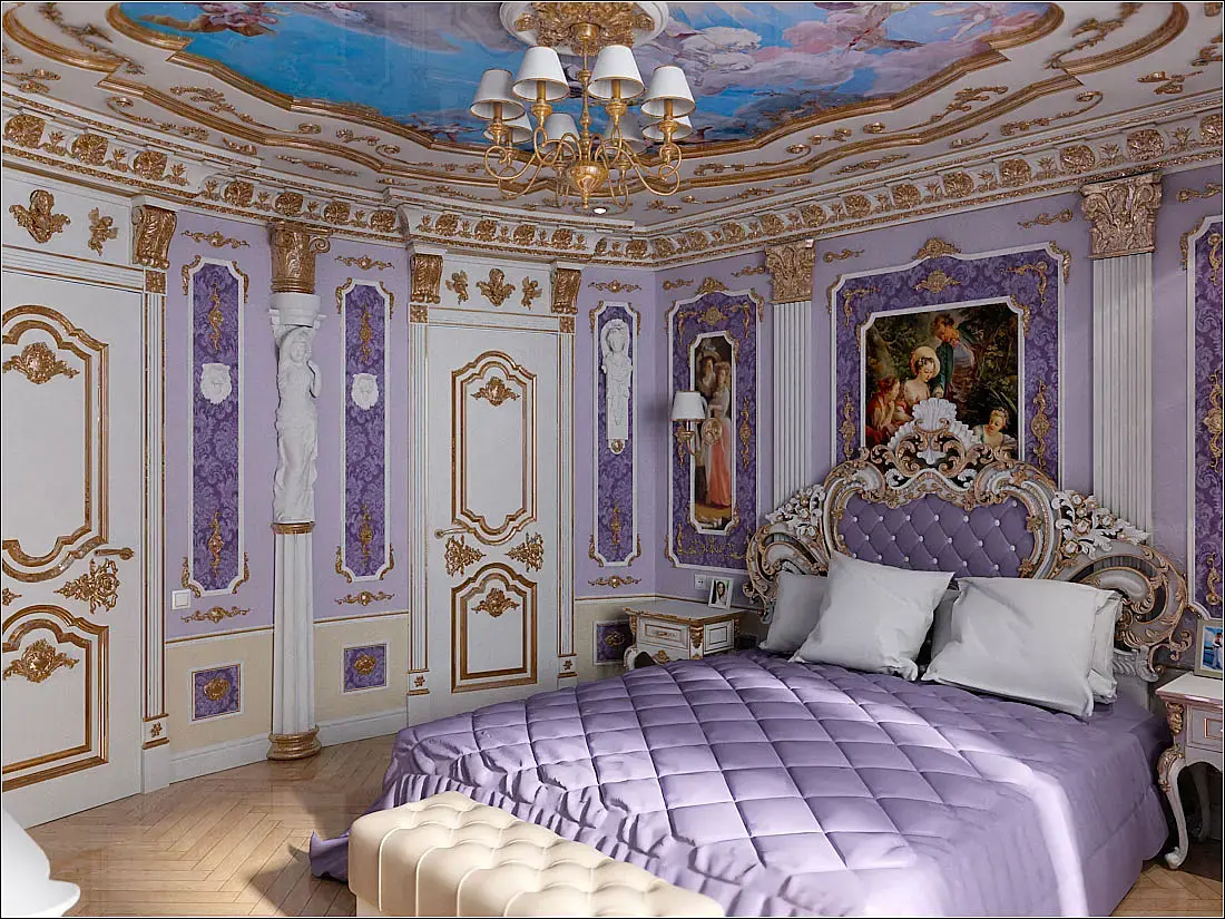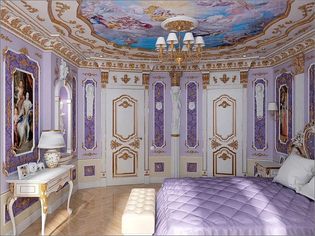 А как по мне- так почти всё и правильно- такие рококошненькие слюни. Повыкидывайте все эти козявки, на стенах и потолке. ( Лепные завитки, которые, как отдельный элемент, вообще ни когда не ставятся. Капители на пилястрах- тупо золочённые- диковато. Под золотом оставьте завиточки-листочки. Люстра может быть вполне. Злобную герцогиню справа от изголовья на лестницу- где родовые портреты, вместо неё- какого то амурчика с писюнчиком. И в общем то вполне употребимо.