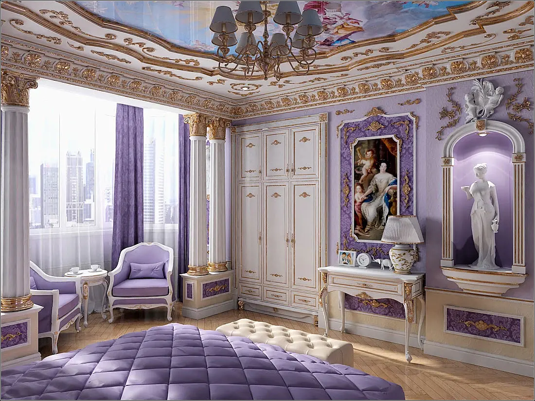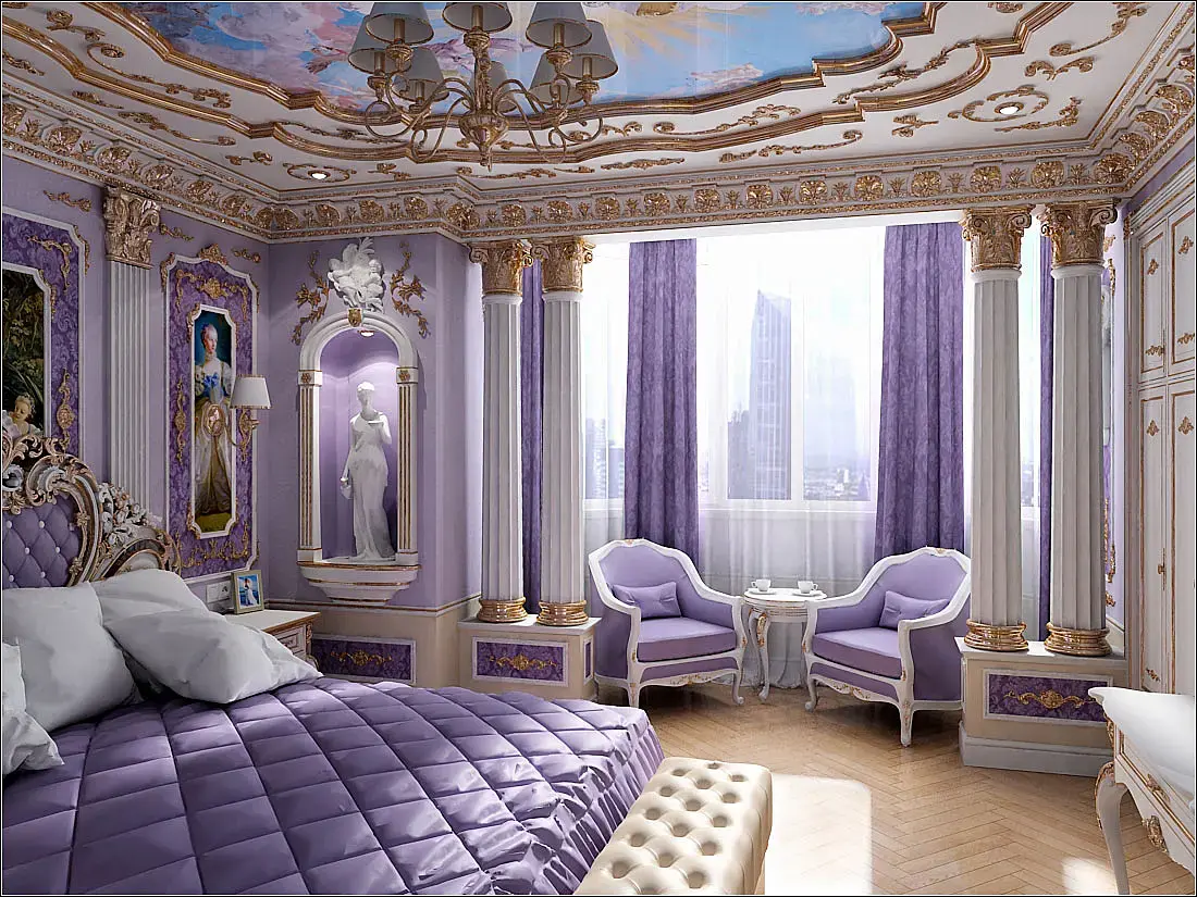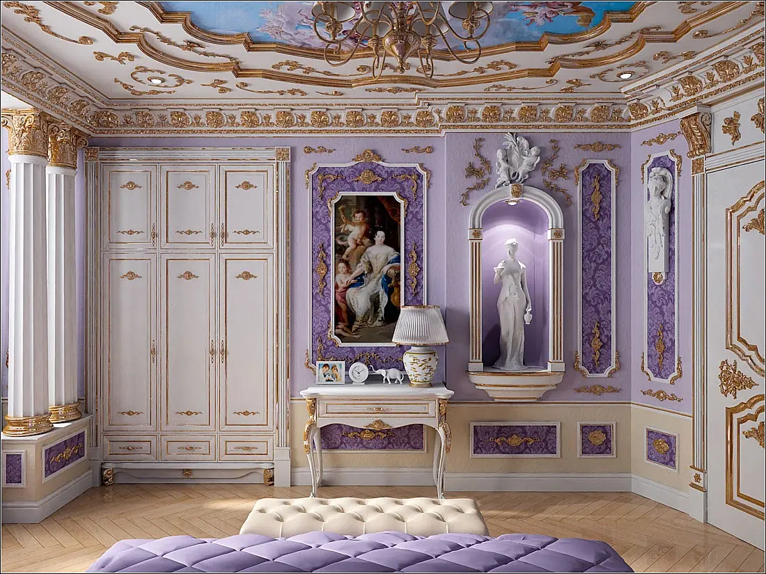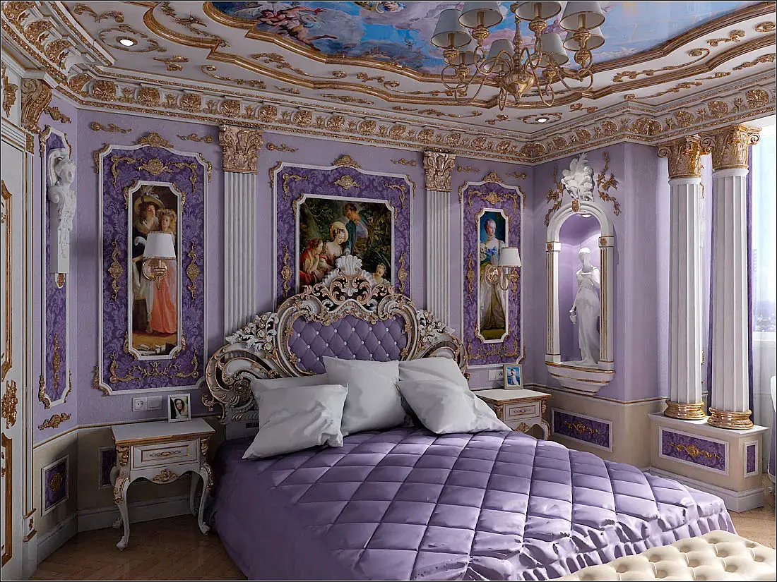 А как по мне- так почти всё и правильно- такие рококошненькие слюни. Повыкидывайте все эти козявки, на стенах и потолке. ( Лепные завитки, которые, как отдельный элемент, вообще ни когда не ставятся. Капители на пилястрах- тупо золочённые- диковато. Под золотом оставьте завиточки-листочки. Люстра может быть вполне. Злобную герцогиню справа от изголовья на лестницу- где родовые портреты, вместо неё- какого то амурчика с писюнчиком. И в общем то вполне употребимо.