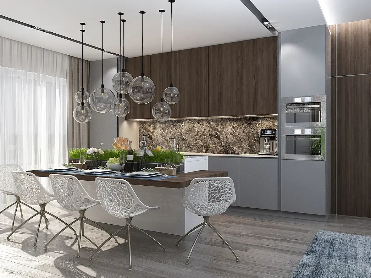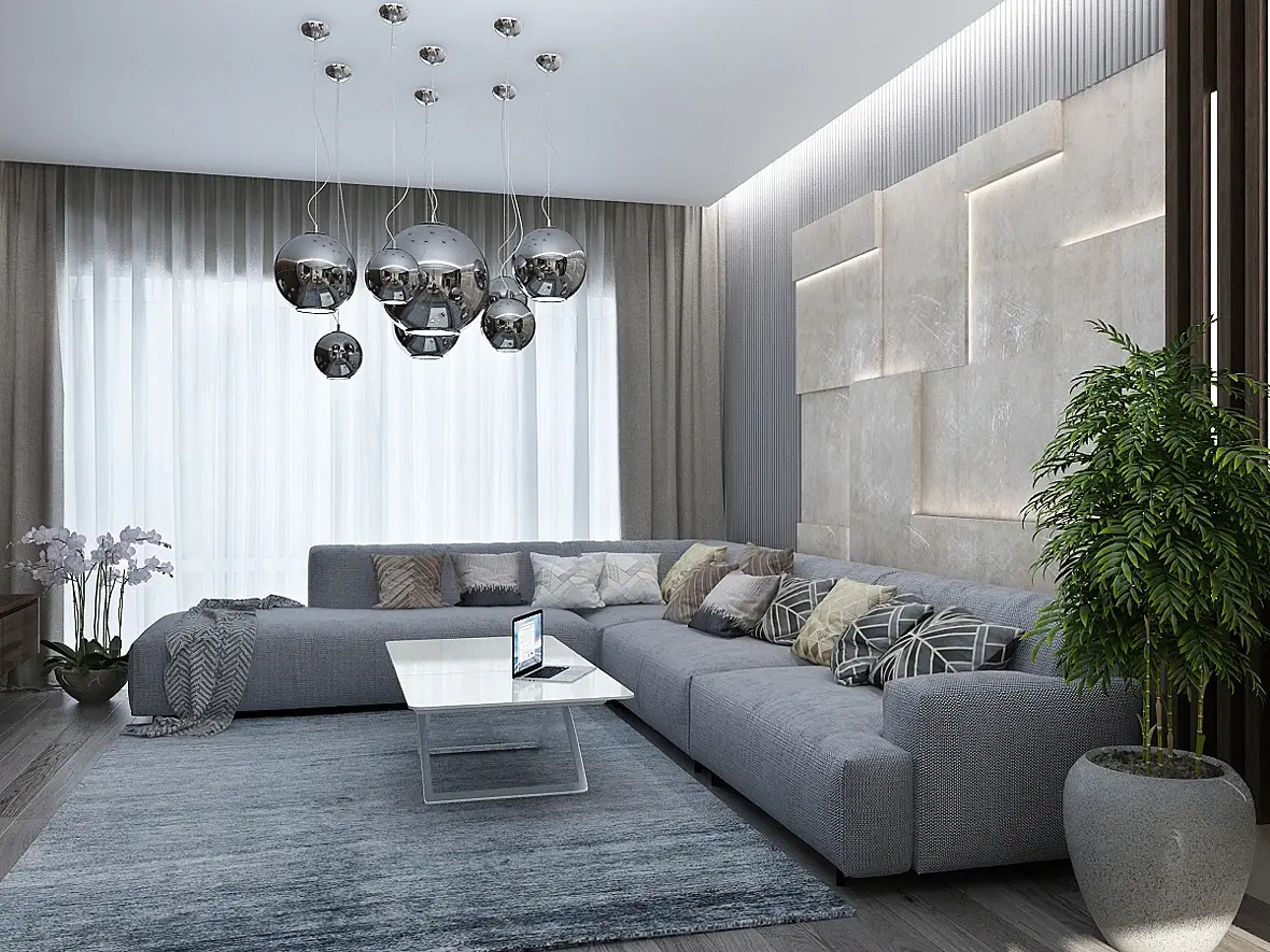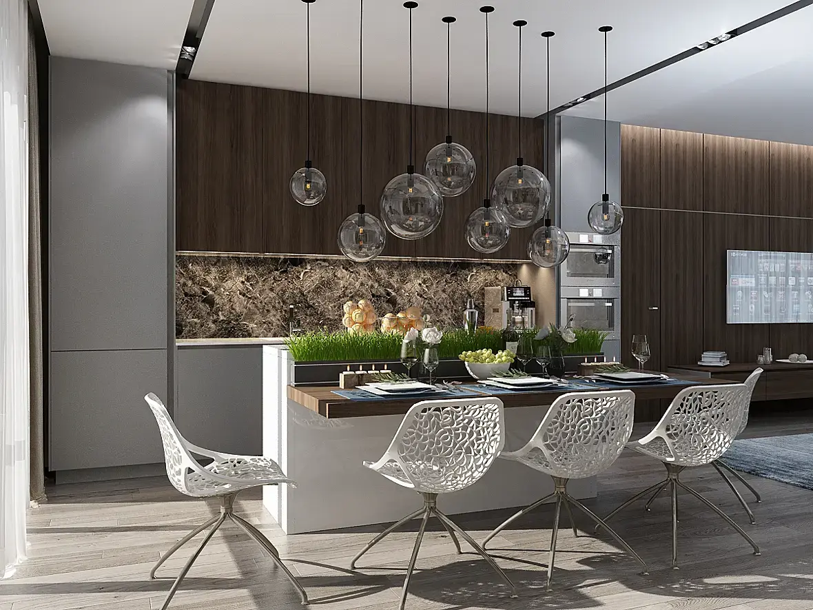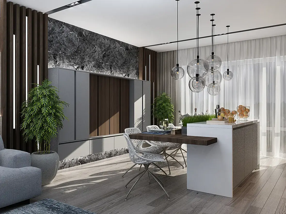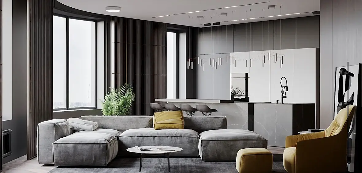 Я работаю в V-Ray, и в 15 Махе, хотелось бы услышать еще замечания по дизайну. Сейчас мне кажется, что все немного скучновато, особенно в гостиной. И может кто подскажет, как улучшить рендер до, к примеру, вот такого уровня: