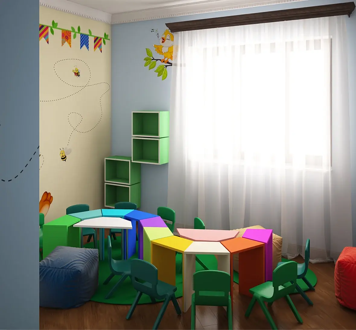 Напроситесь со знакомыми родителями в садик сходите и посмотрите функционал помещений, ясно что дизайном там, скорее всего и пахнуть не будет - но функции Вы разглядите. Главное чтоб не упекли с подозрением на педофилию)))
