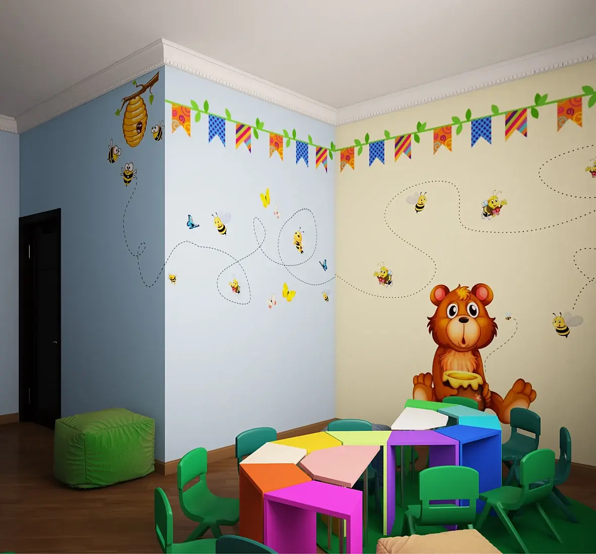 Напроситесь со знакомыми родителями в садик сходите и посмотрите функционал помещений, ясно что дизайном там, скорее всего и пахнуть не будет - но функции Вы разглядите. Главное чтоб не упекли с подозрением на педофилию)))