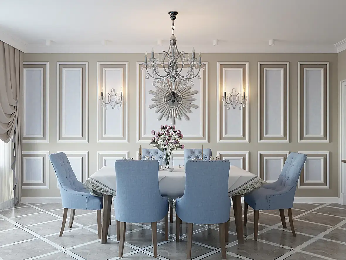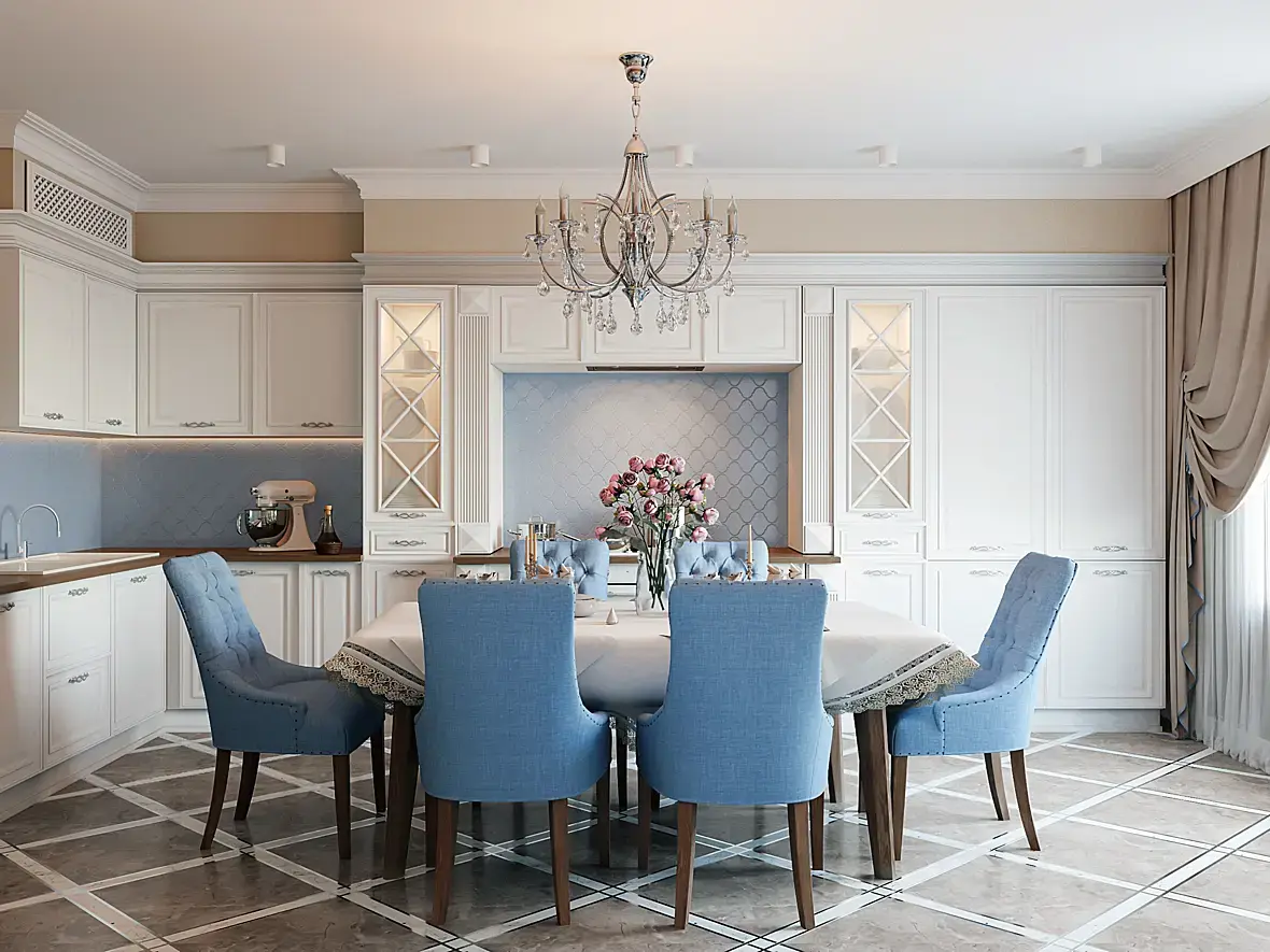 С технической стороны в помещении будет мало света в вечернее время, рекомендую помимо локального освещения (люстр) предусмотрите общий свет (точечные светильники, карданы). Учли ли вы подводку вент. трубы к вытяжке?. Если нет то возможно над кухней появится гипсокартонный короб либо нужно будет весь потолок опустить (под встраиваемые светильники все равно придется это сделать).