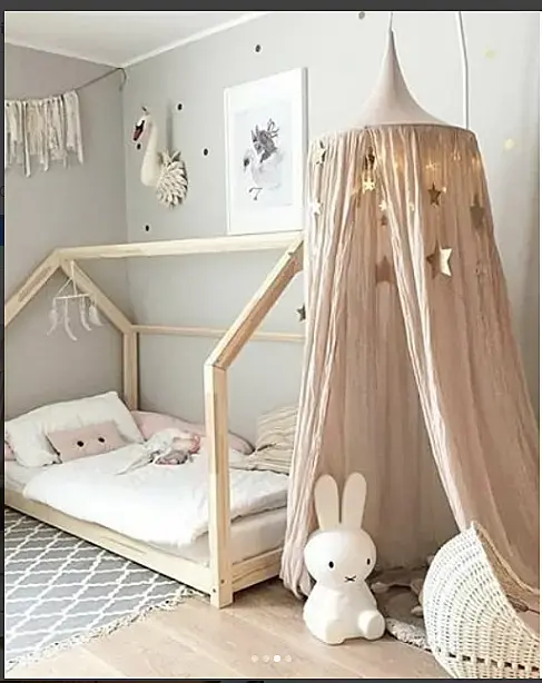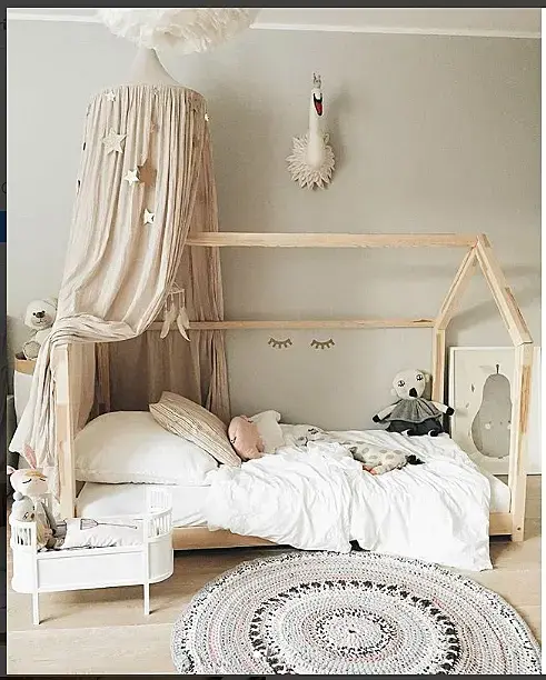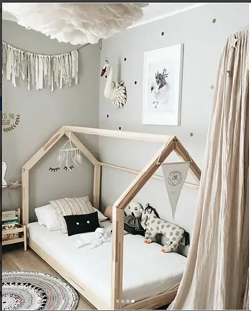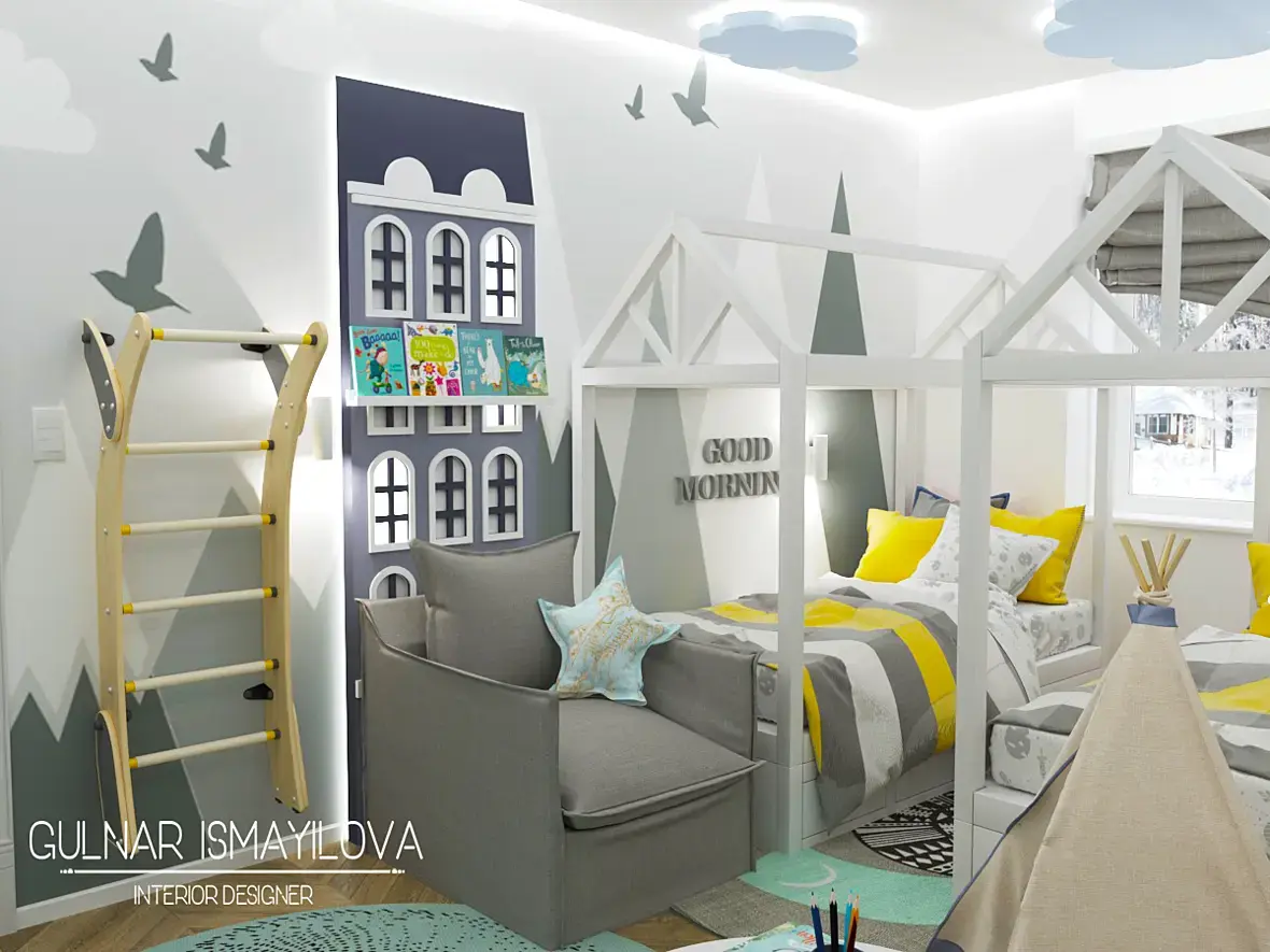 Я бы пересмотрел кровати в первую очередь. Их можно оставить, но убрать каркас в виде домика. Далее убрал бы надписи - гуд морнинг и светильники рядом с ними, светильники можно сделать в изголовье. Есть специальные, детские, мягкие, диодные светильники. Уберите светящуюся надпись - Играть.