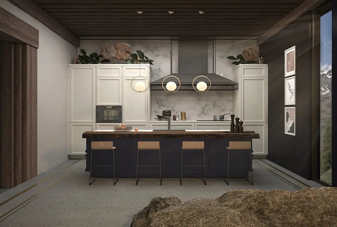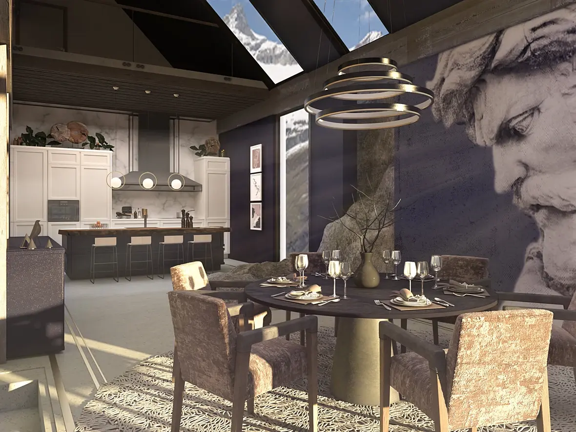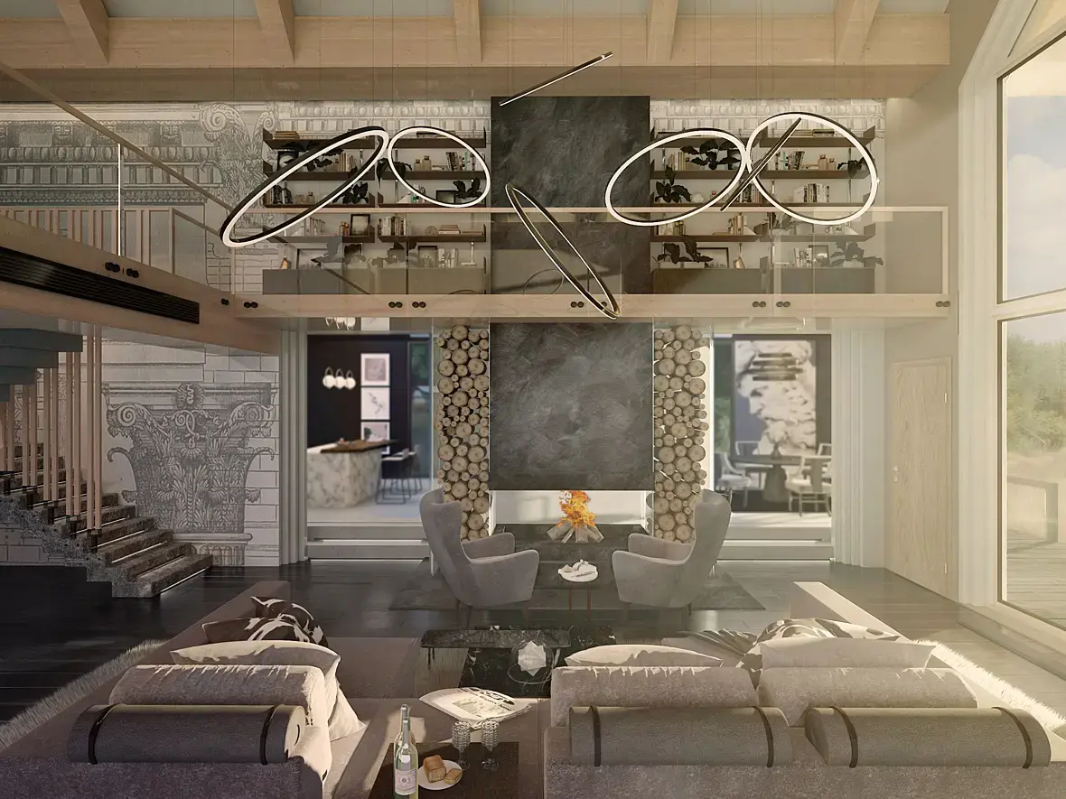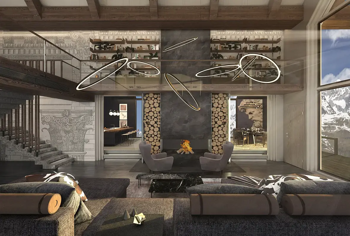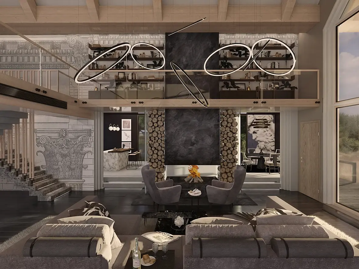 - Статую которая пытается выбраться из камина, сейчас очень сильно спорит с группой светильников. Фигура теряется на их фоне. Я бы отказался от такого спорного решения в пользу светильников. К тому же такие статуи были интересны в далеком 2005 году. Лучше выделите каменную часть при помощи красивого натурального черного камня с прожилками. Будет смотреться благородней и лаконичней.