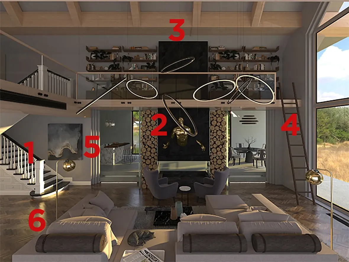 1. Кажется немного неуместной лестница. Резная лестница не сочетается со вторым уровнем который выполнен в более простой форме и при помощи современных материалов.