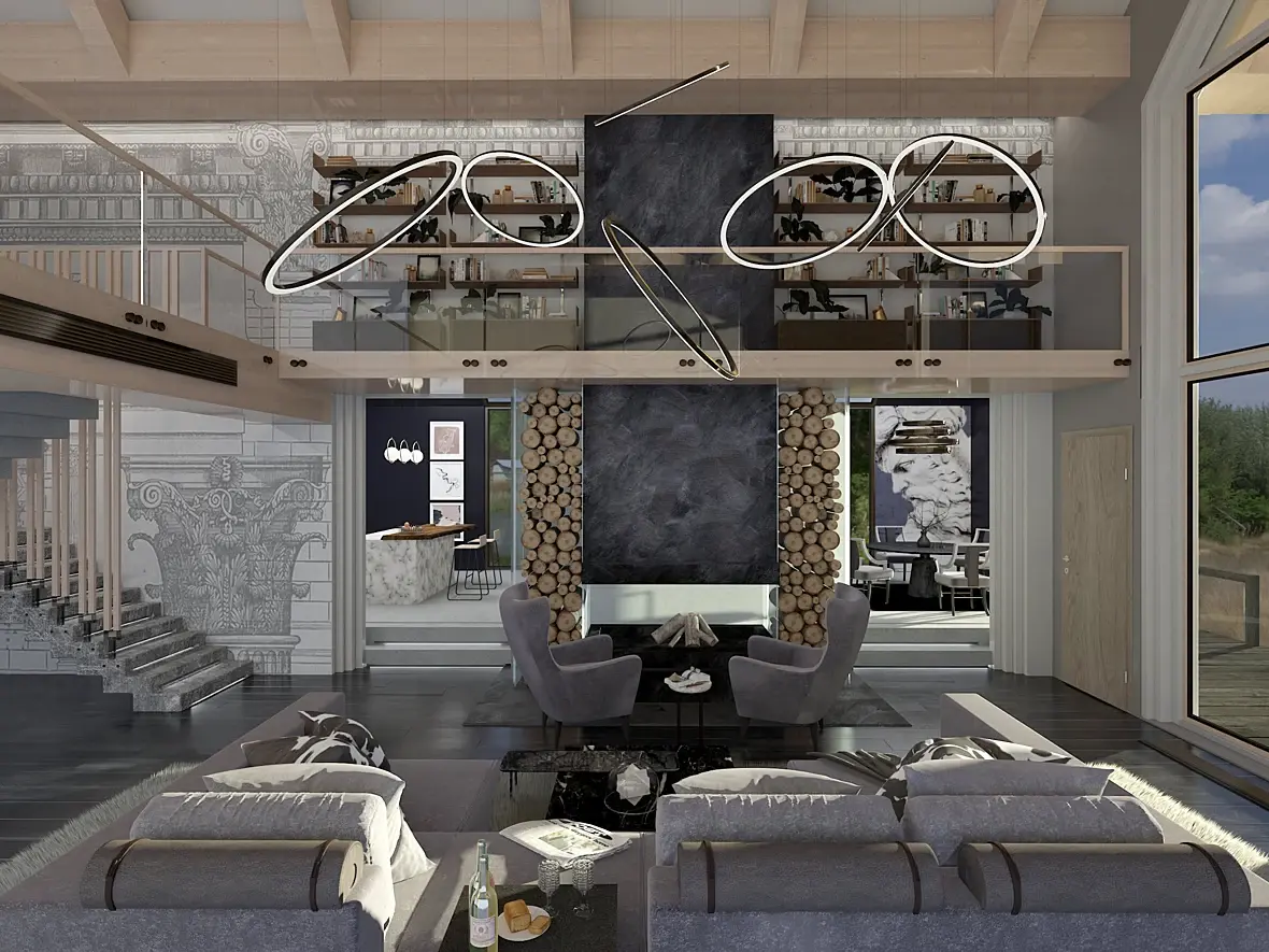 - Статую которая пытается выбраться из камина, сейчас очень сильно спорит с группой светильников. Фигура теряется на их фоне. Я бы отказался от такого спорного решения в пользу светильников. К тому же такие статуи были интересны в далеком 2005 году. Лучше выделите каменную часть при помощи красивого натурального черного камня с прожилками. Будет смотреться благородней и лаконичней.