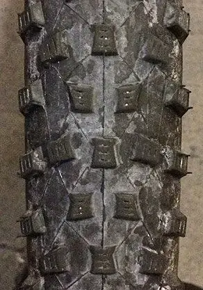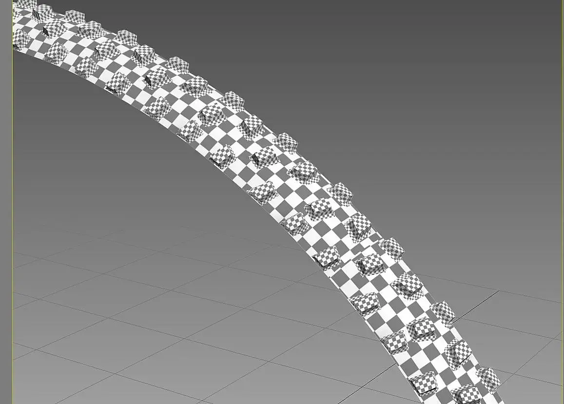 Я в начале делал так: моделил один сегмент с шипами, бендил подгонял чтоб он был по форме покрышки в фас и профиль, потом смещал центр в ноль и аррейем этот сегмент копировал и сшивал края сигментов меж собой , а только потом делал развертку в анварпе, развертка была кривой и не получалось красиво нарисовать на шипах прорези для бампа