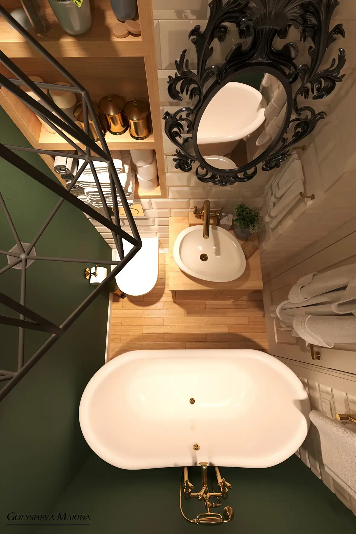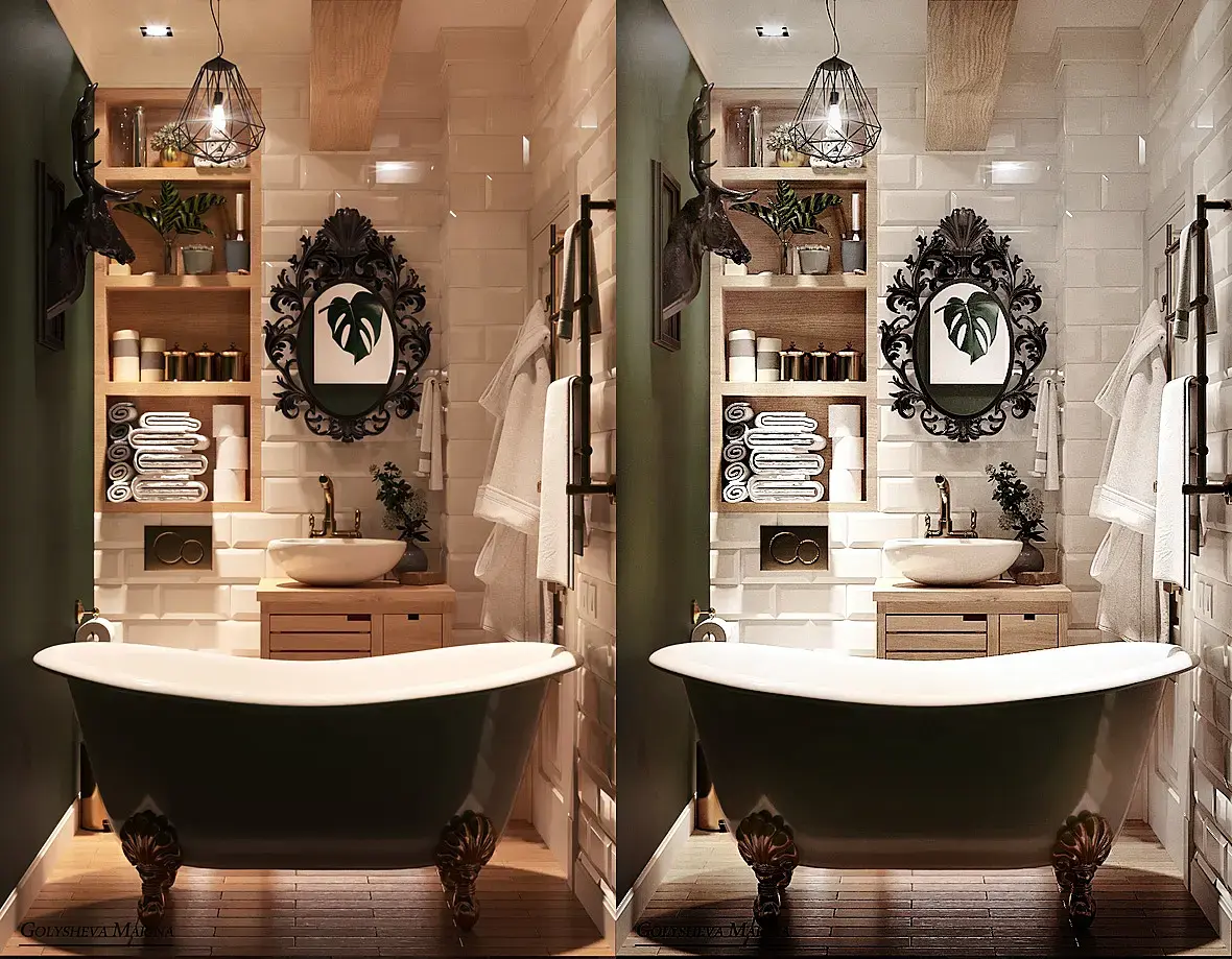 Для галереи я бы переделала и расширила комнату. Чтобы тумба дверь не перекрывала. Отдельно ракурс на ванну и отдельно на раковину.