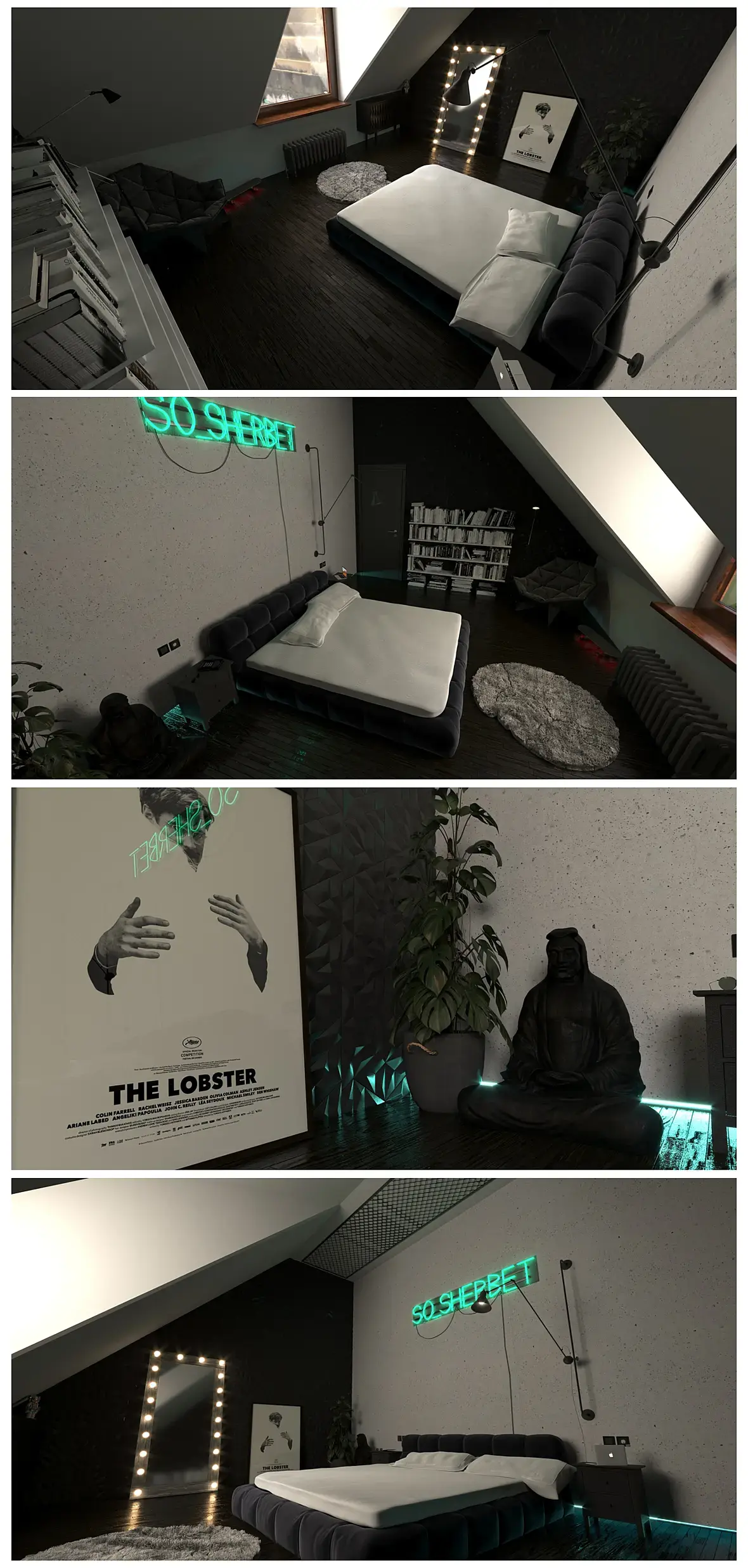 Если абстрагироваться от дизайна, по визам: композиция кадра на всех картинках не удачная. У камер слишком вытянутый FOV. Постельное однозначно надо менять, ведь очень много доступных бесплатных моделей (это похоже на два пельменя на тесте). Подоконник поправить - вылетел далеко. Размер тумб сомнительный, мне кажется не в масштабе. Под розетки дырочки вырезать или убрать их вообще. Материал пола слишком блестит и размер самих плашек сомнительный (уж очень они маленькие, хотя может так и задумывалось). Вообще вопросов было бы больше,если бы был настроен свет. Свет очень плохой. Естественный дает неприятный желтый оттенок и при такой схеме освещения он должен преобладать над искусственным, а они примерно равнозначны и в целом не смотря на то что всё якобы включено, ничего не видно и не разобрать. С яркость светильников нужно работать - всё включено, но при этом что-то лупит, а что-то не светит вообще. Если это в короне рендарилось Highlight compress накрутите, пересветы убрать. А вообще по дизайну здесь больше вопросов, чем по визам, поэтому лучше начать с этого, хотя если не стоит такой задачи, то и пускай. И вообще я не эксперт, просто имхо)