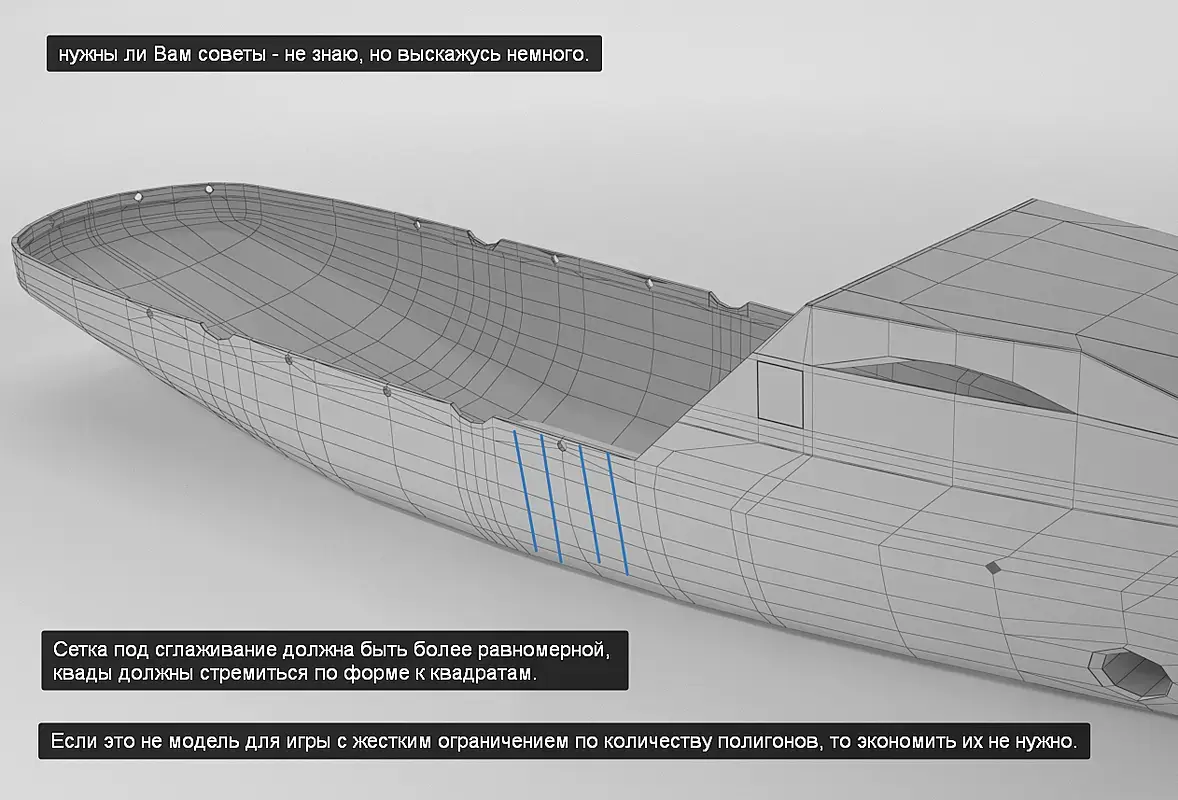 Я бы такой баркас делал , например, через две итерации, т.е модель формы-турьосмуф разок- конверт в поли и уже тут дырки вырубать, потом уже основной смуф. Колич-во итераций для примера, зависит от ситуации