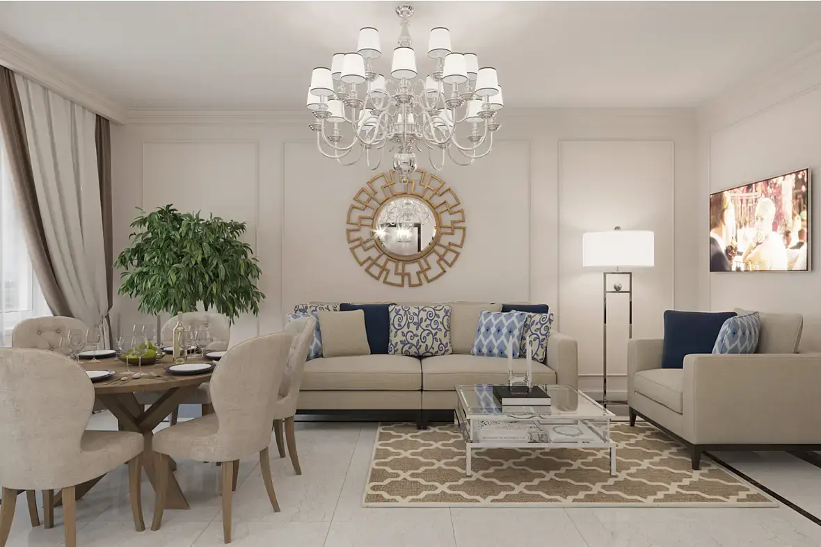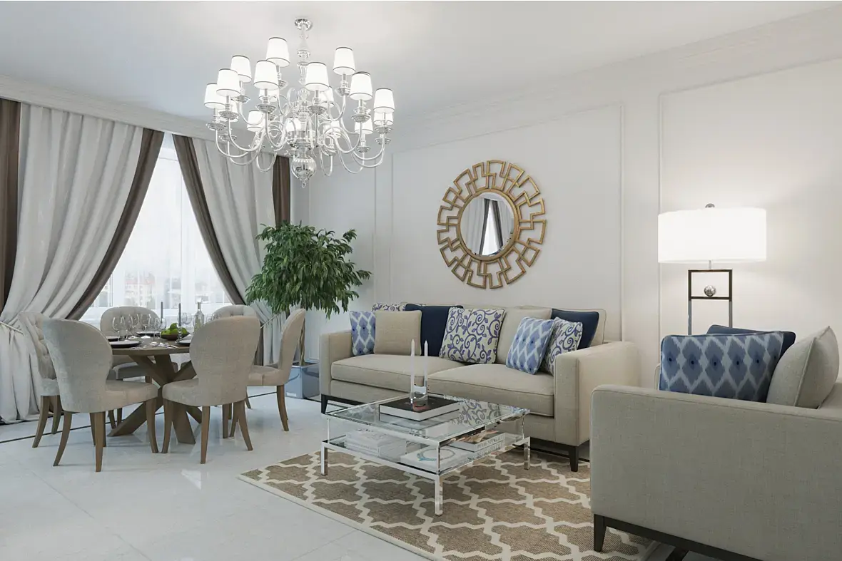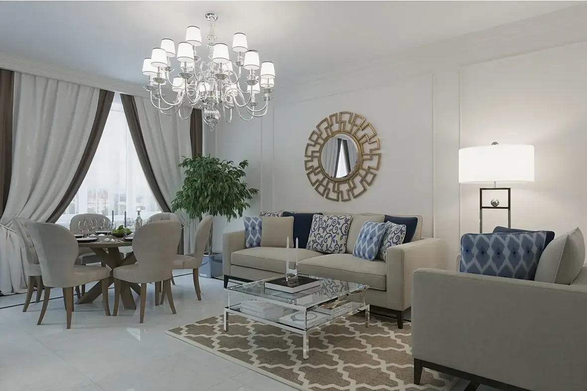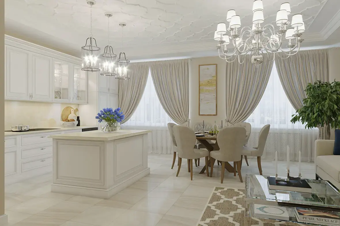 Не бойтесь делать свет от люстр, бра и прочих источников не белым, а желтым (гораздо желтее чем на примерах выше), а свет из окон холодным (как у вас было), картинка сразу оживится. Когда отовсюду лупит белый свет - интерьер выглядит никакущим, даже с интересным дизайном. И не забывайте про баланс белого в экспозиции, он очень важен.