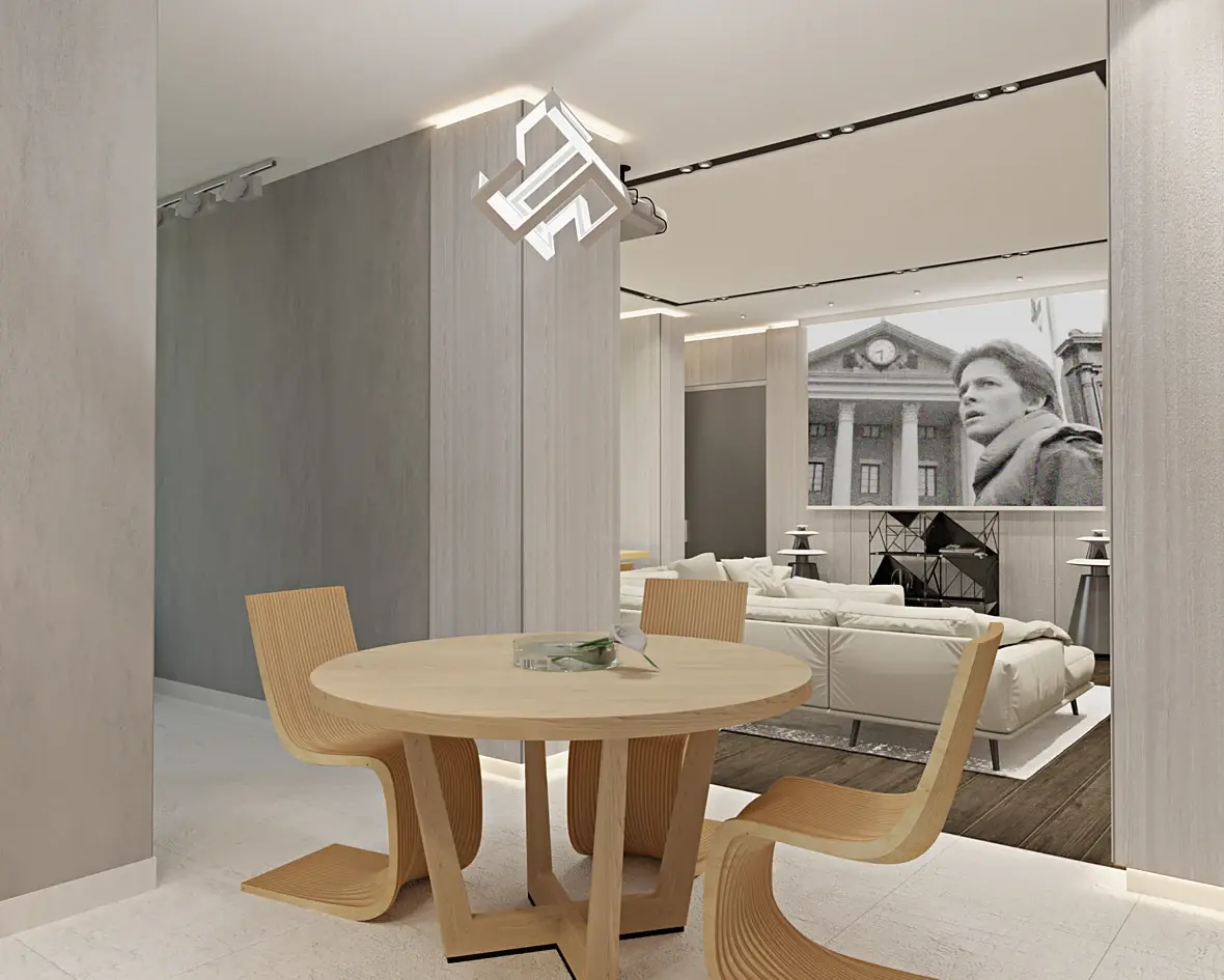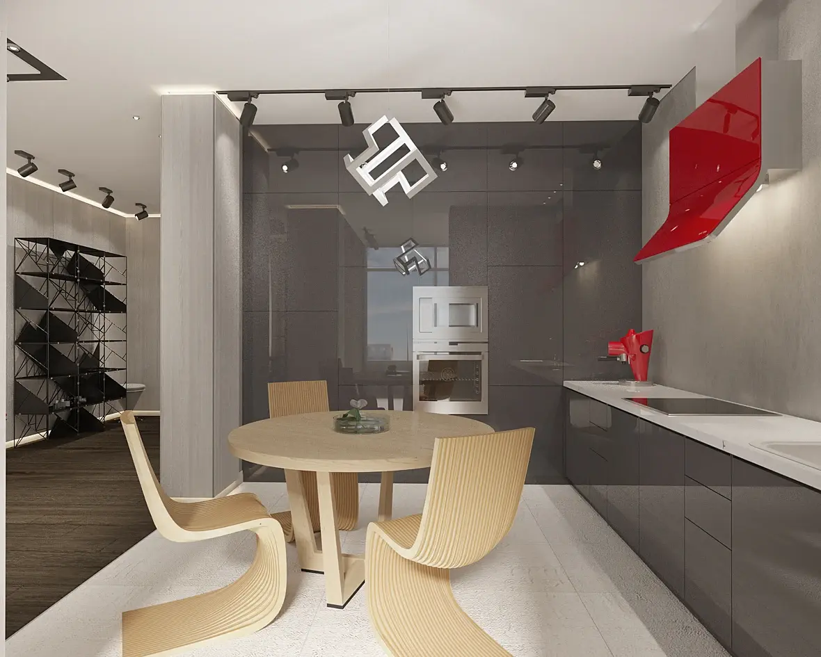 я бы заменила люстру над столом(сюда хочется что-то на тонких проводах оформленных в геометрическую форму) и одинаковое напольное покрытие на кухне и в гостиной! на кухне еще добавила бы открытые полки с каркасом, и серые простенки слишком одинаковые какие то части стен можно сделать темно- серыми!!