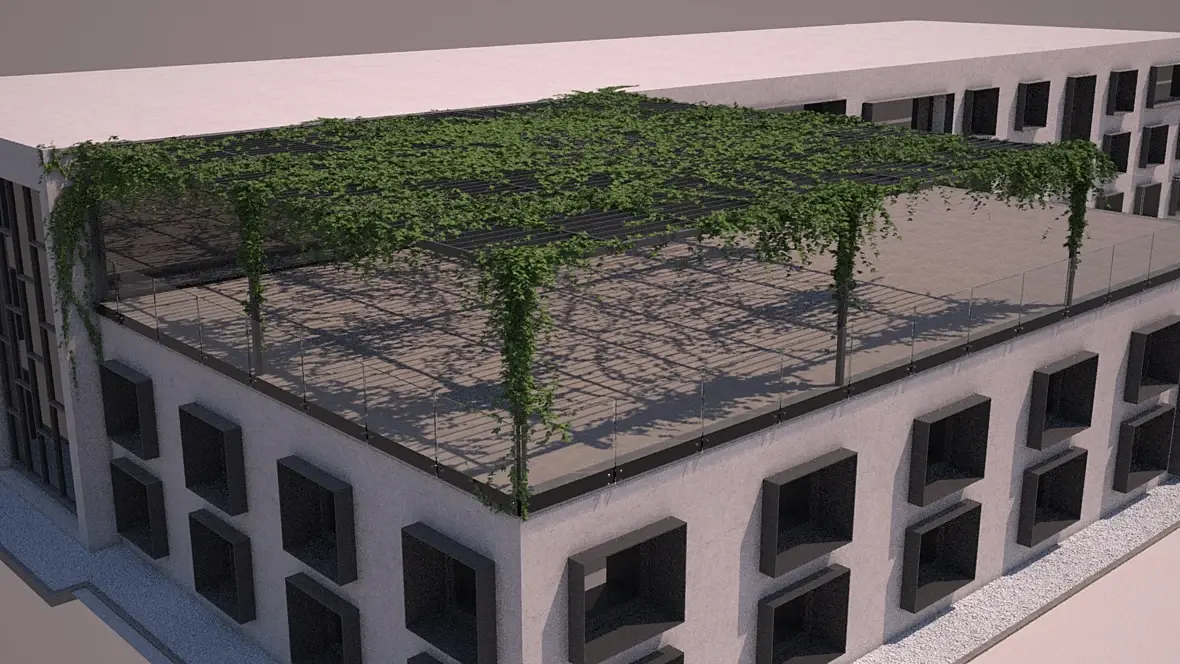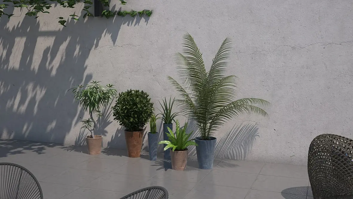 Ваш плющ не имеет никаких шансов (вроде как, не утверждаю на 100%) на то, чтобы отражаться в стеклянном ограждении, если речь про него идет. При текущих настройках материалов, света, камеры и ее позиции.