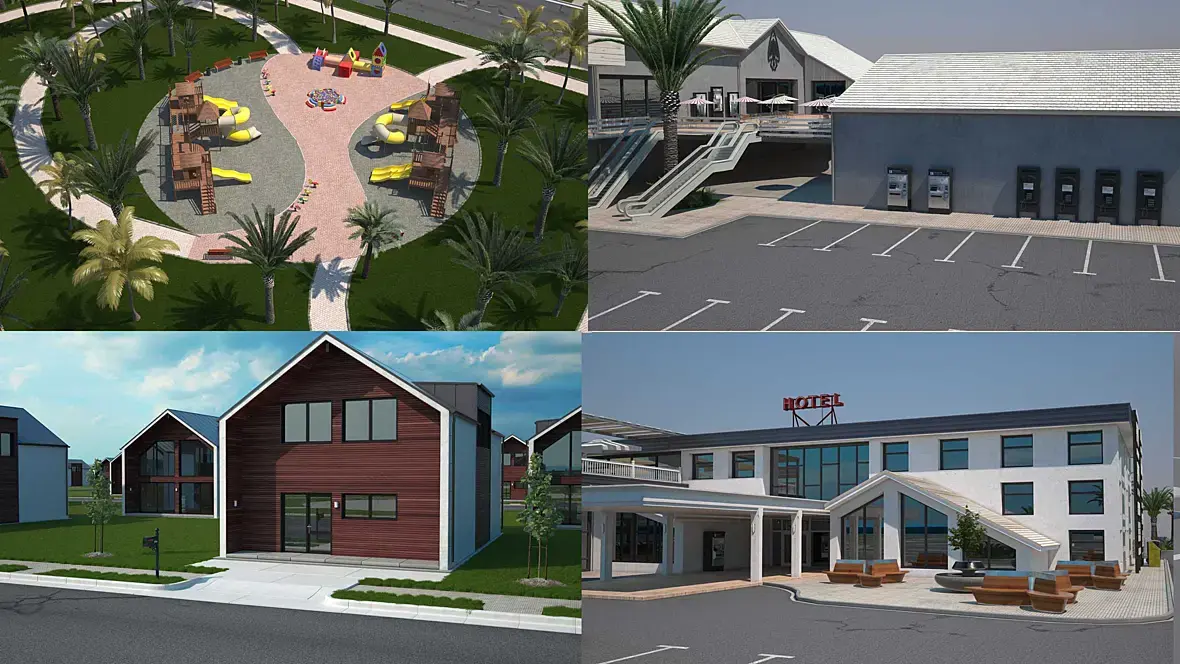 Все здания сделал, за моделинг заплатили 30 т.р., сейчас на этапе при-ландшафтного дизайна, ну и некоторые моменты с дизайном зданий переделываю (текстура в основном, не могут определиться.) Местность тоже нарисовал, дороги и т.д. с материалами тоже пока не понятно т.к. они решили бетонные плиты класть вместо тротуара, а заместо травы гальку, пальмы тоже менять будут на деревья, они сначала с архитектором это делали, но тот им не понравился, решили мне доплатить, чтоб я им сделал разные варианты. Вот и вышло так сначала сделал одно им не понравилось, теперь переделываю, но за доплату.