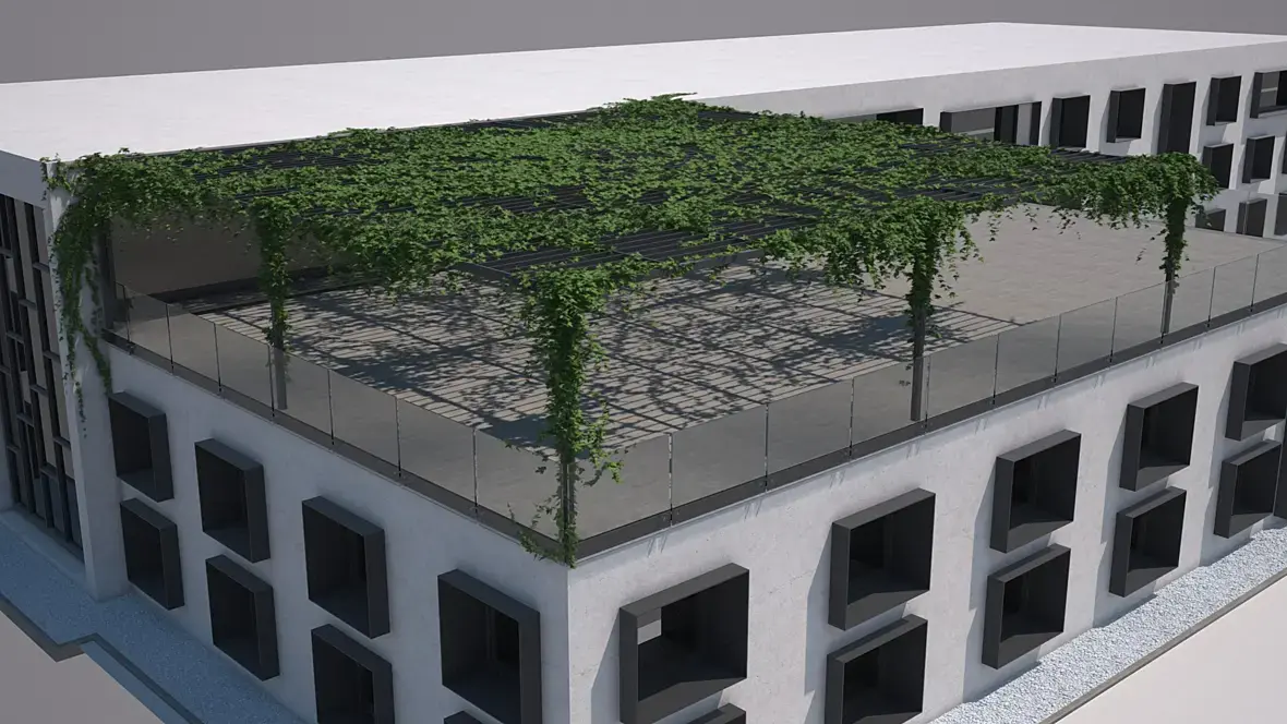 Ваш плющ не имеет никаких шансов (вроде как, не утверждаю на 100%) на то, чтобы отражаться в стеклянном ограждении, если речь про него идет. При текущих настройках материалов, света, камеры и ее позиции.
