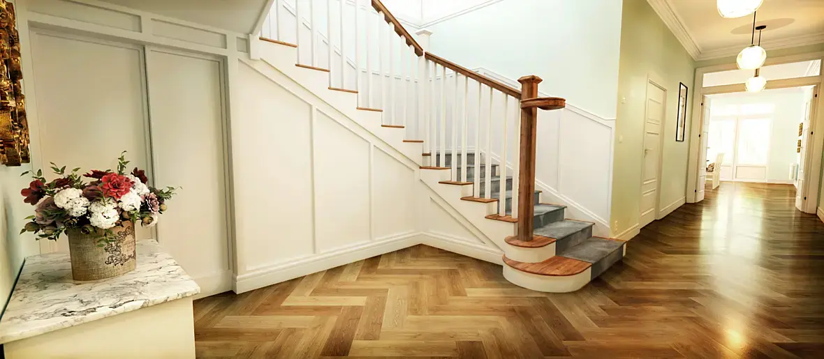 Паркет не в масштабе Лестница, на сколько я вижу, тоже не попала в масштаб, либо перила высокие либо марш узкий. (С учетом того, что высота перил не ниже 900 мм)