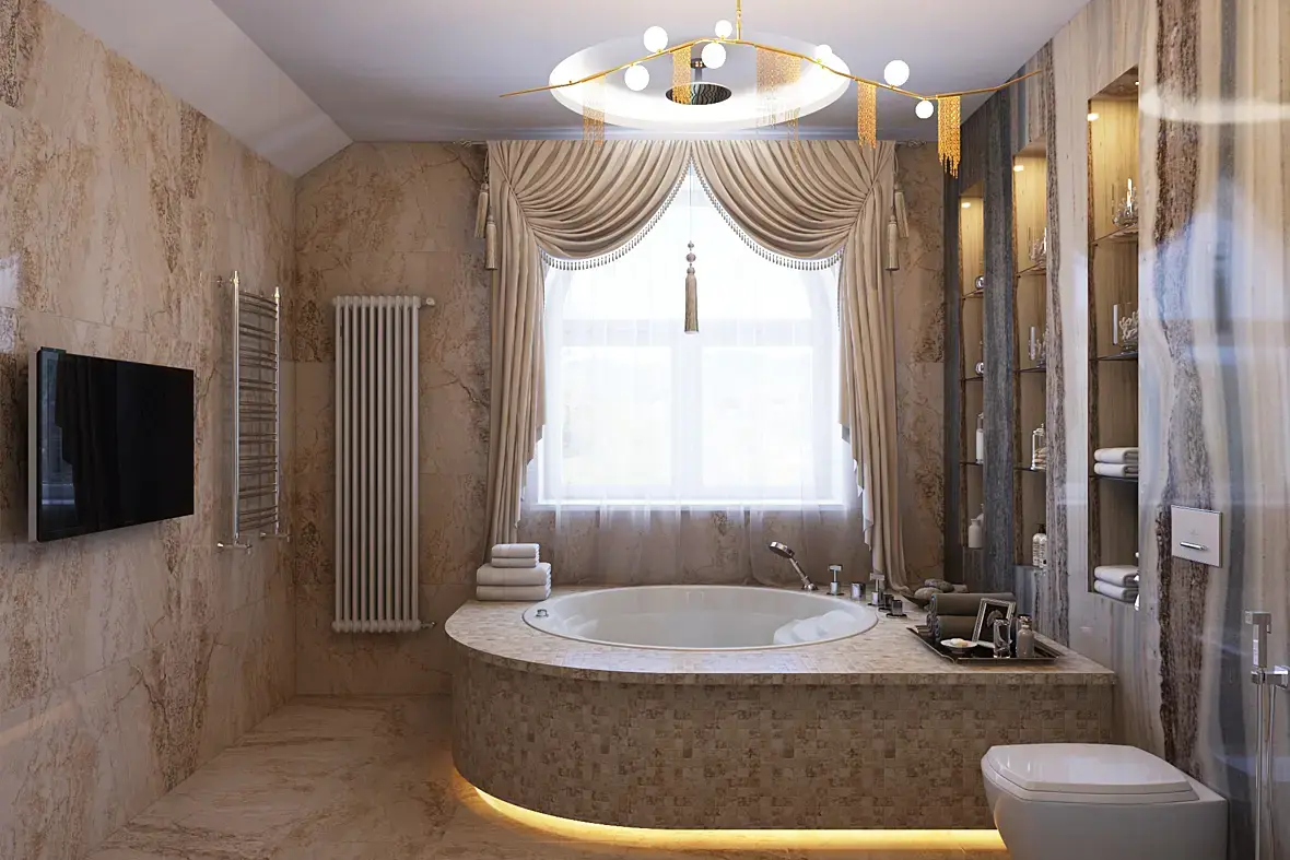 почему дверь без коробки? Зачем ей ничем не поддерживаемая капитель? Панно за зеркалом и в углу ванной как-то может сопротивляться постоянному воздействию воды?