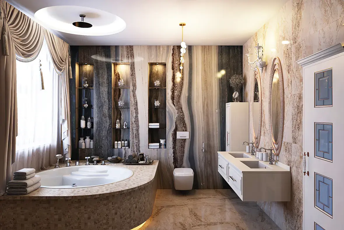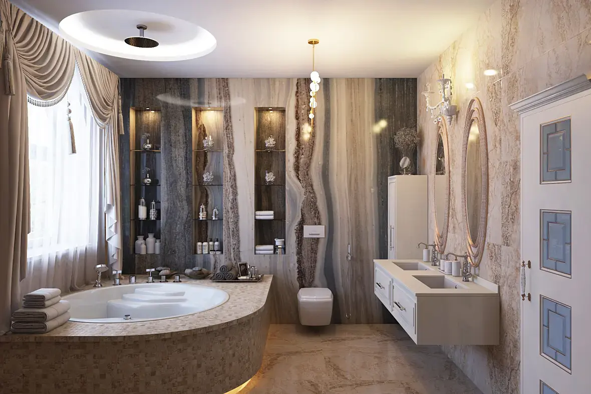 почему дверь без коробки? Зачем ей ничем не поддерживаемая капитель? Панно за зеркалом и в углу ванной как-то может сопротивляться постоянному воздействию воды?