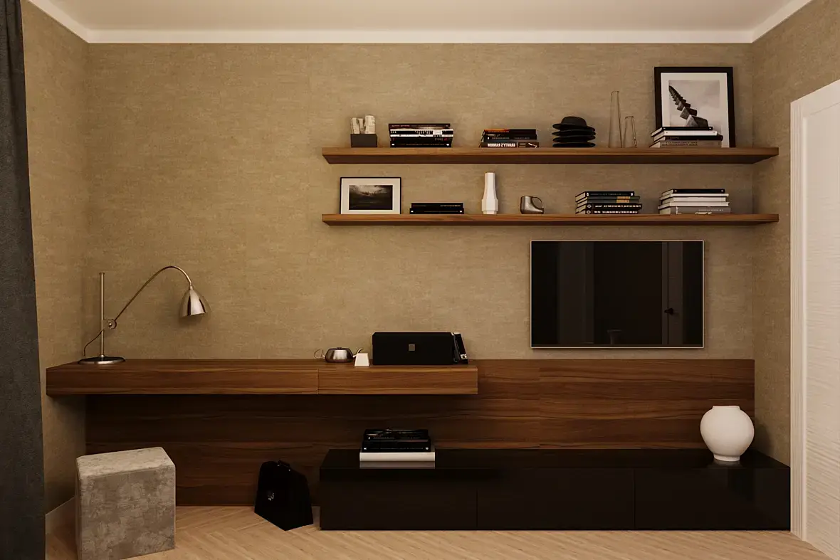 Декор бессмысленный. Вазы случайные в непонятных местах. На полках - кавардак, нет композиции. Лучше меньше да лучше.