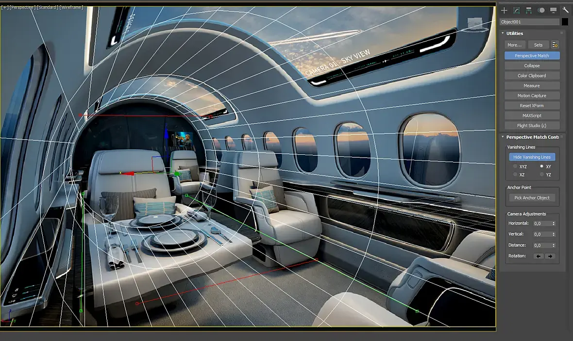 Добрый день, мучаюсь и не могу выставить перспективу и ракурс камеры как на этом рендере, чтобы все точно совпадало. Уже всё перепробовал, перспективу менял, на рендере самолет вроде наклонён-это тоже учитывал. Создавал в начале плейн пола, вроде подогнал, потом ставил цилиндр для дальней стены, тоже подогнал, подходит, начинаю вытягивать из него всю остальную цилиндрическую форму самолета на себя, вроде тоже нормально, но когда начинаю вырезать отверстия для окон, то разрезы не совпадают. Крутил ещё fov в камере от 45 до 60, тоже не получилось подогнать. В рендере может присутствует эффект Fish-eye?