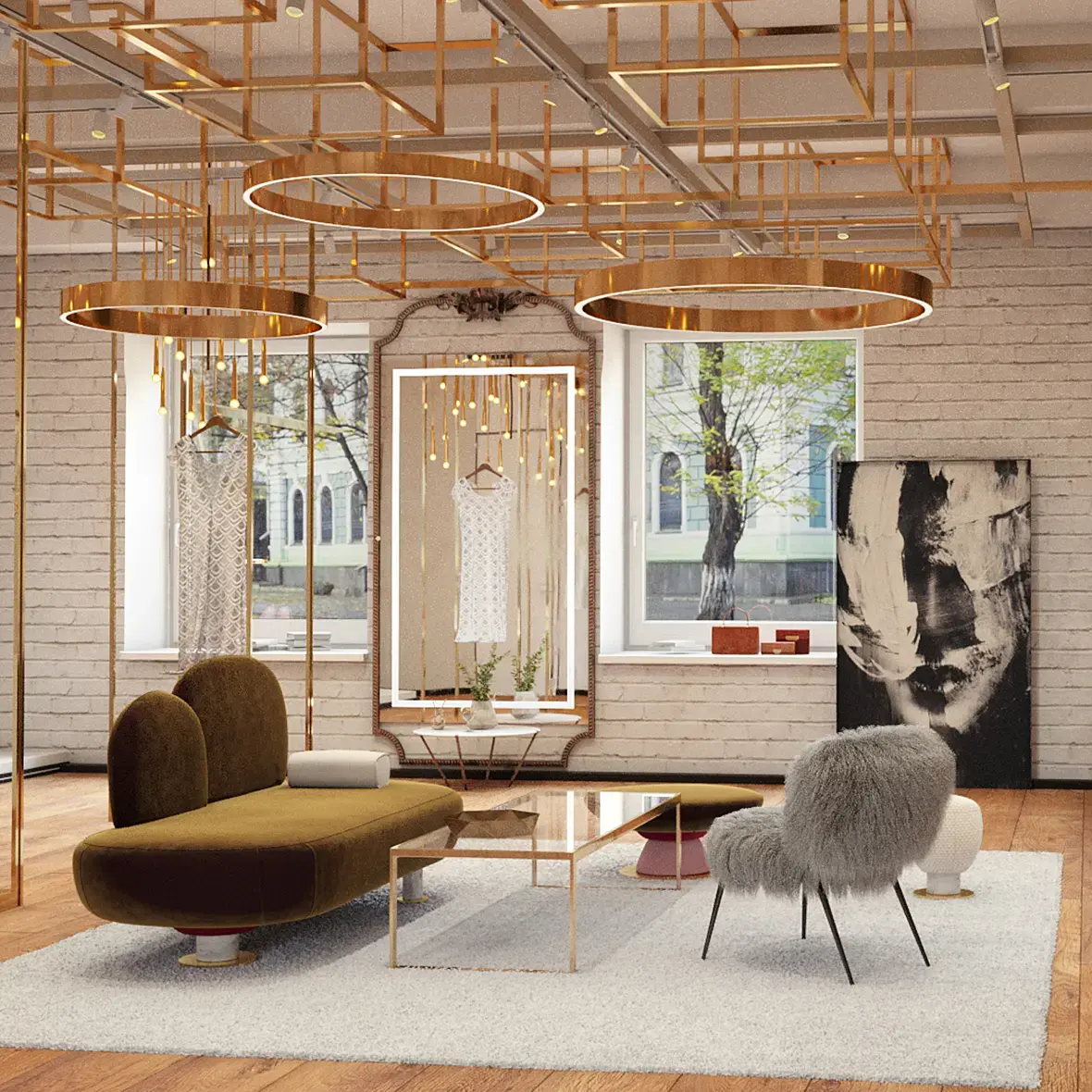 в нишах расположила металлические конструкции. А опора одна для трековых светильников на потолке. И то что вы видите где висит платье конструкция для эксклюзивных моделей (платьев) которая проходит от пола до потолка. Заказчица очень довольна.