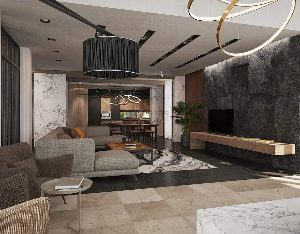 Переведите все в сермат и настройте для начало фоновой естественный свет, и потом уже по очередности добавляя искусственный свет внутри интерьера. Возможно первая проблема в освещении, что он не взаимодействует между собой, второе уже материалы и из взаимодействие со светом.