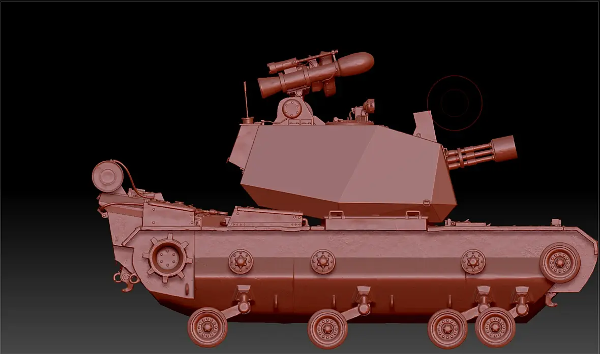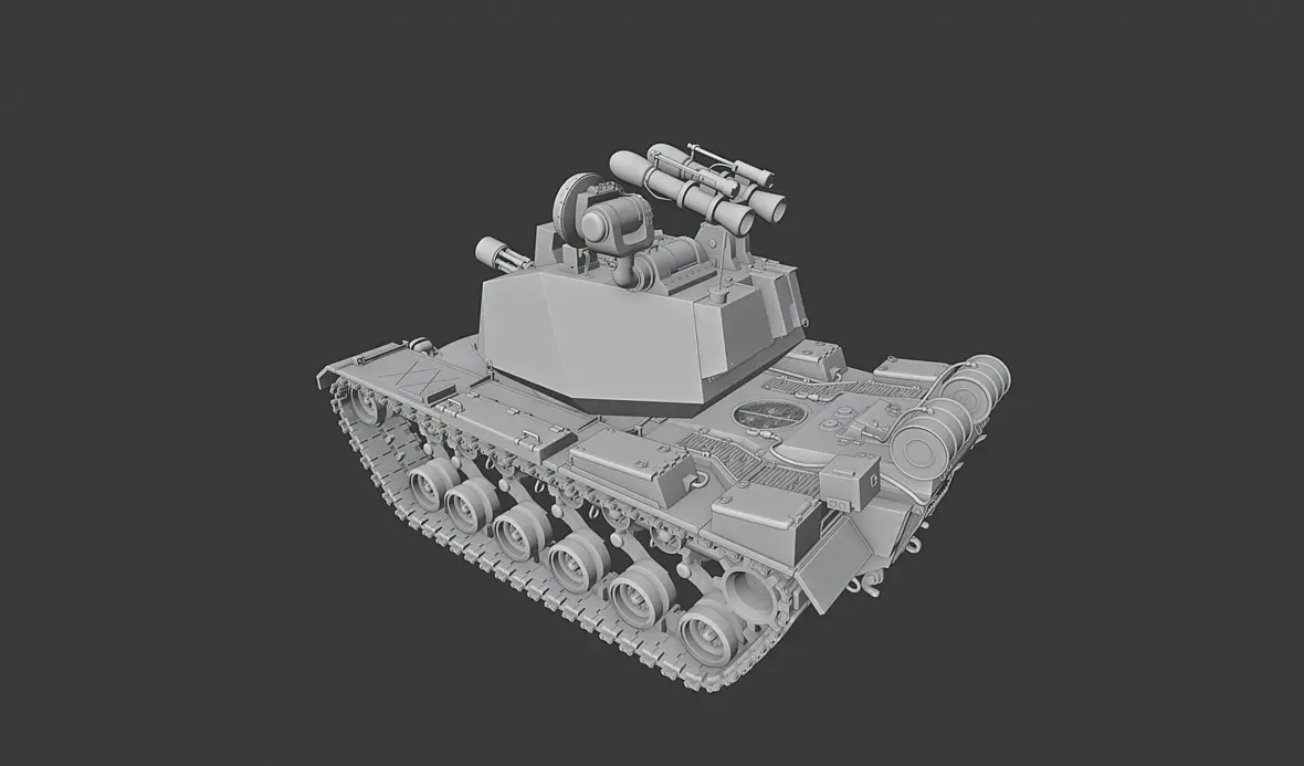 Ну Если уж точнее то это буржуйская "SPAA" m247 sergant york на шасси танка m60 Паттон, которую я нещадно перепилил, заменив оригинальные 30mm пушки на гатлинг и добавив две ракеты вместо левой радарной башенки =)