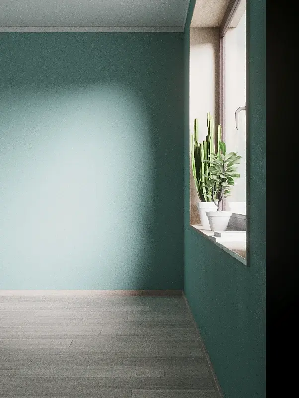 За окном дейсвтилеьно нужна поверхность  имитирующая асфальт или землю для реалистичного освещения, так как от нее будет свет отскакивать в помещение, но оно даст лишь свет на потолке и стенах, а не  то что вы спрашиваете