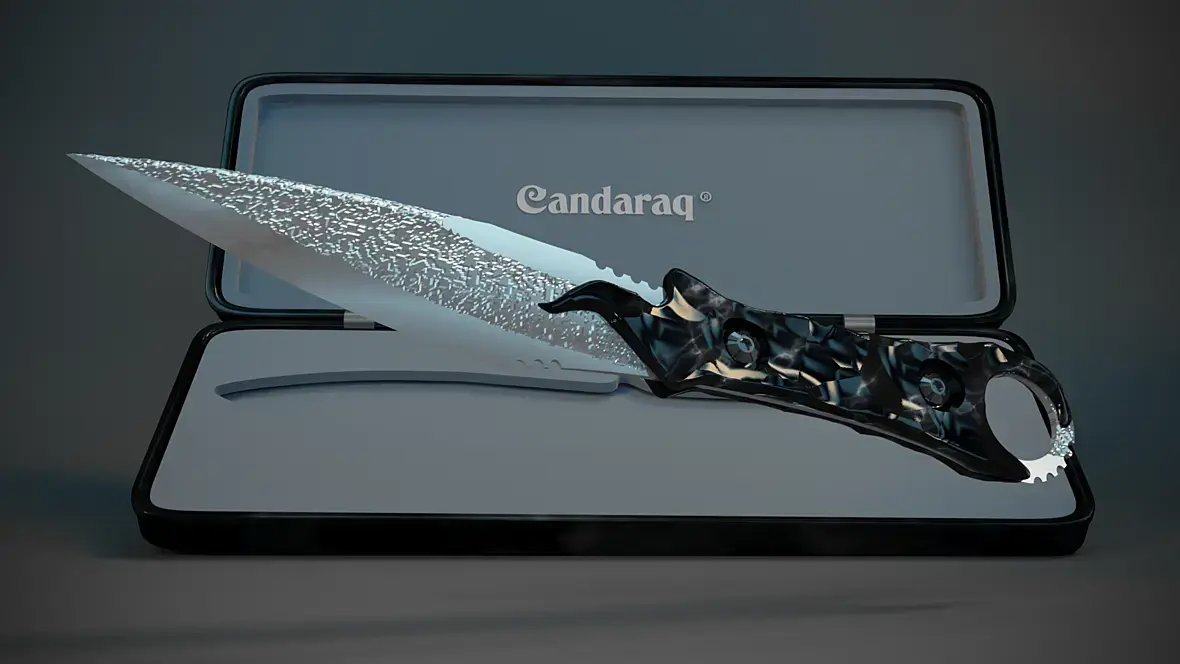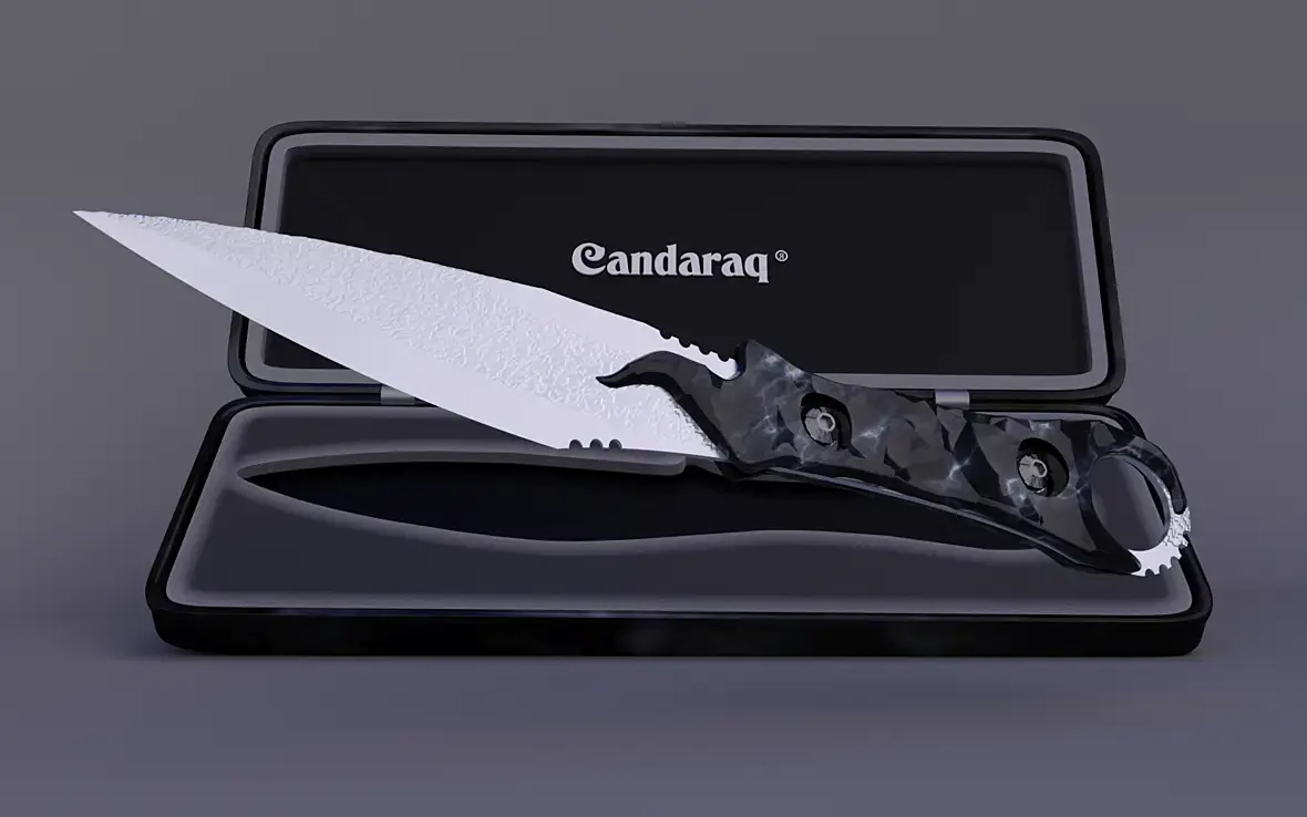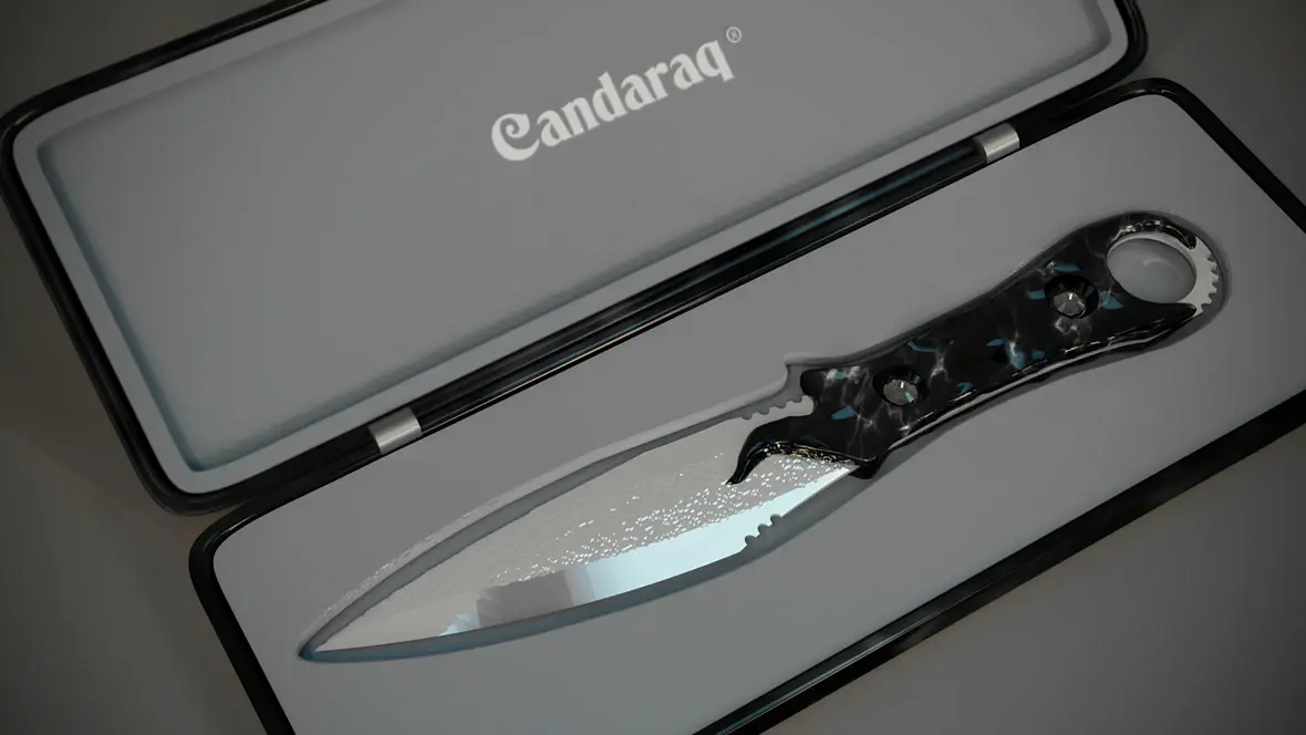 Добавлю про лезвие - оно сейчас выглядит скучным. А бы посоветовал нож положить на стол перед футляром и разместить камеру так, чтоб в лезвии появилось отражение футляра - будет интереснее.